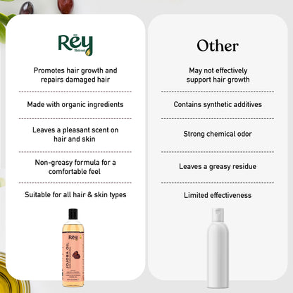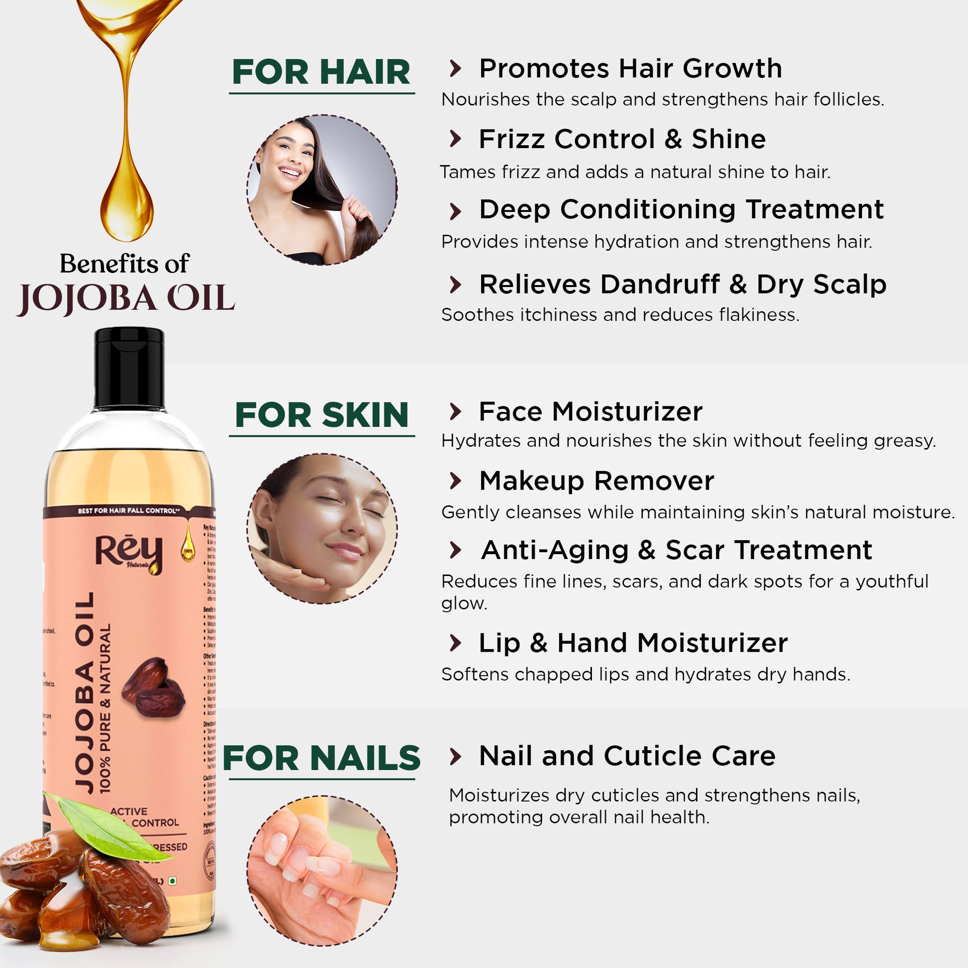 • HAIR GROWTH ENHANCEMENT: Regular use of Rey Naturals Jojoba Oil improves hair appearance and promotes hair growth.