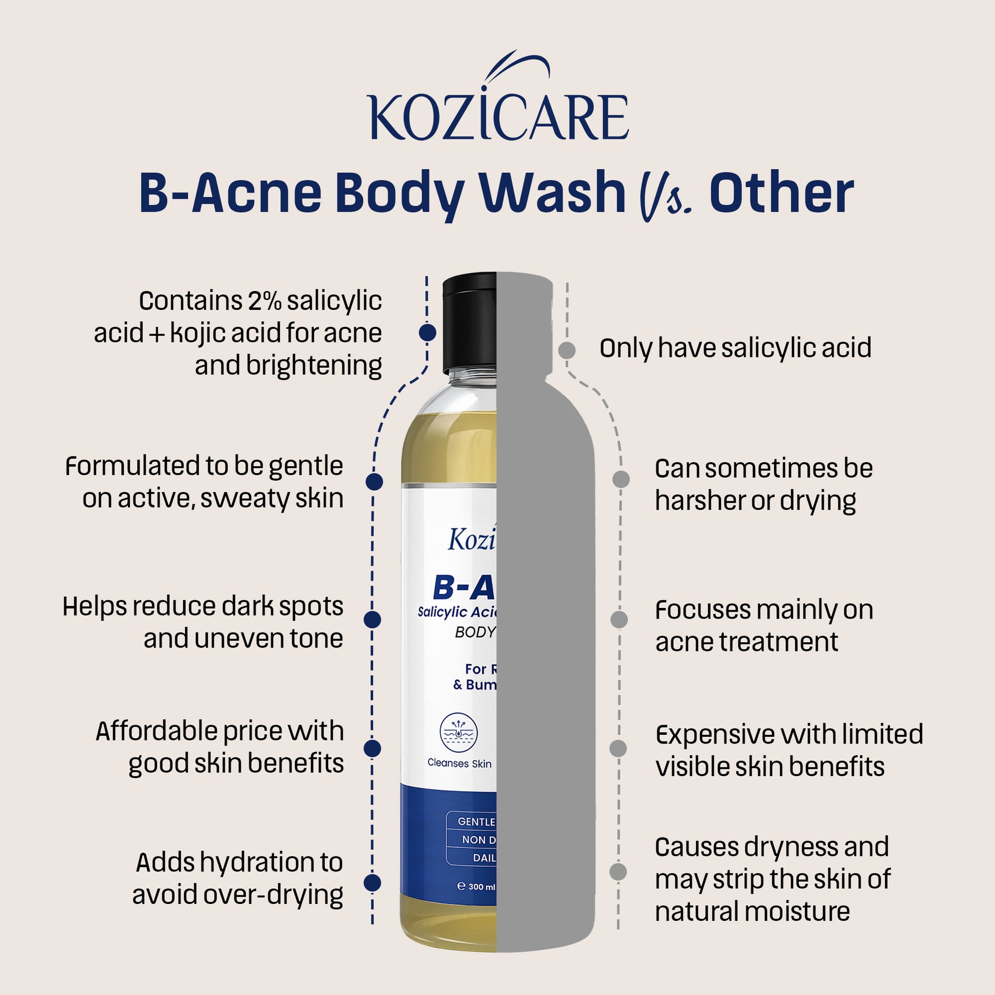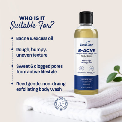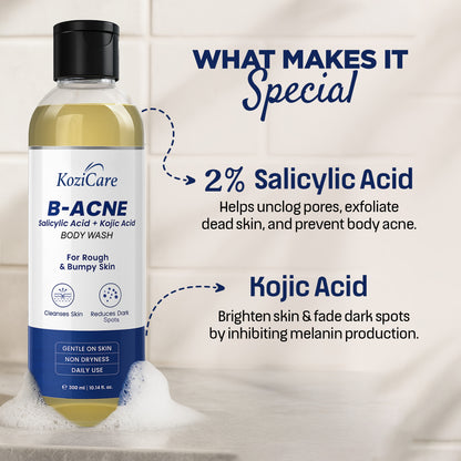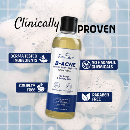 Introducing the 300 ml Kozicare B-Acne Kojic Acid Body Wash, expertly formulated by Kozicare to target acne and dark spots effectively. This refreshing body wash gel combines the power of 2% Salicylic Acid and Kojic Acid, designed to gently exfoliate and cleanse acne-prone skin while revitalizing your shower experience.