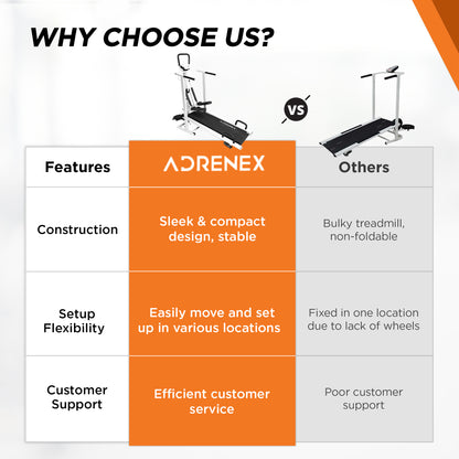 Introducing the Adrenex by Flipkart 4 in 1 Multipurpose Pro Manual Treadmill, designed to enhance your fitness journey. This treadmill features a sturdy alloy steel frame that supports up to 100 kg of user weight, making it both reliable and efficient for home workouts. Its compact, foldable design (57.2cm x 21cm x 57.2cm) ensures that it fits into any space effortlessly, ideal for those who live in smaller homes.