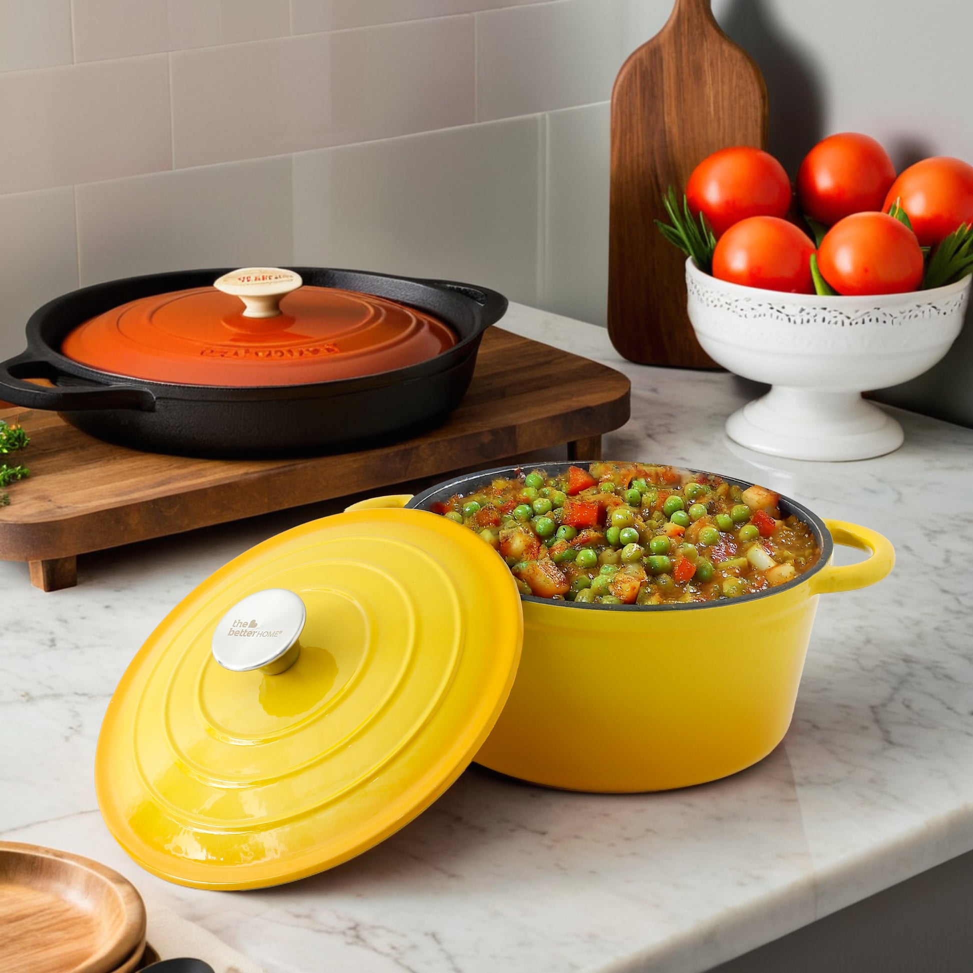• HIGH-QUALITY CONSTRUCTION: Crafted from durable cast iron, featuring a glossy yellow enamel finish and a secure lid for lasting performance.