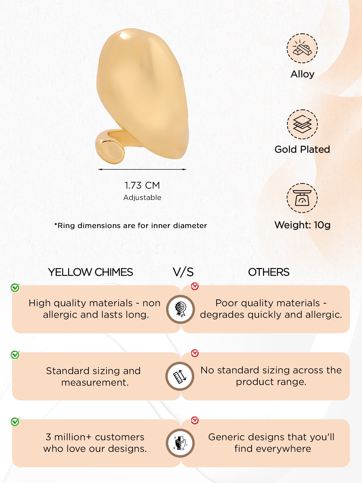 Introducing the Adjustable Gold Plated Statement Style Finger Ring by Yellow Chimes, a stunning accessory designed for the modern woman. This exquisite ring, crafted from high-quality alloy with a beautiful gold plating, is not only adjustable to fit various finger sizes but also radiates elegance and sophistication. The bold, irregular shape adds a unique flair, making it perfect for any occasion, whether it's a night out, daily wear to the office, or a romantic date.