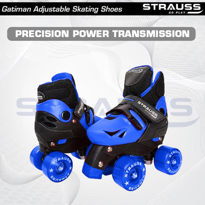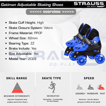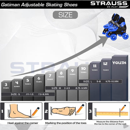Introducing the STRAUSS Gatiman Adjustable Skating Shoes, the latest designed roller skates perfect for both boys and girls. With an adjustable fit accommodating four sizes, these skates are designed to grow with your child. The striking Black/Blue design not only looks great but also enhances visibility during use.