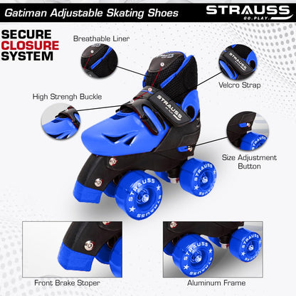 STRAUSS Gatiman Adjustable Outdoor Wheel Skating Shoes | Latest Designed Roller Skates With Break | Ideal For Boys And Girls | Adjustable 4 Wheels Skating Shoe | Size: Sub-Junior (Black/Blue)