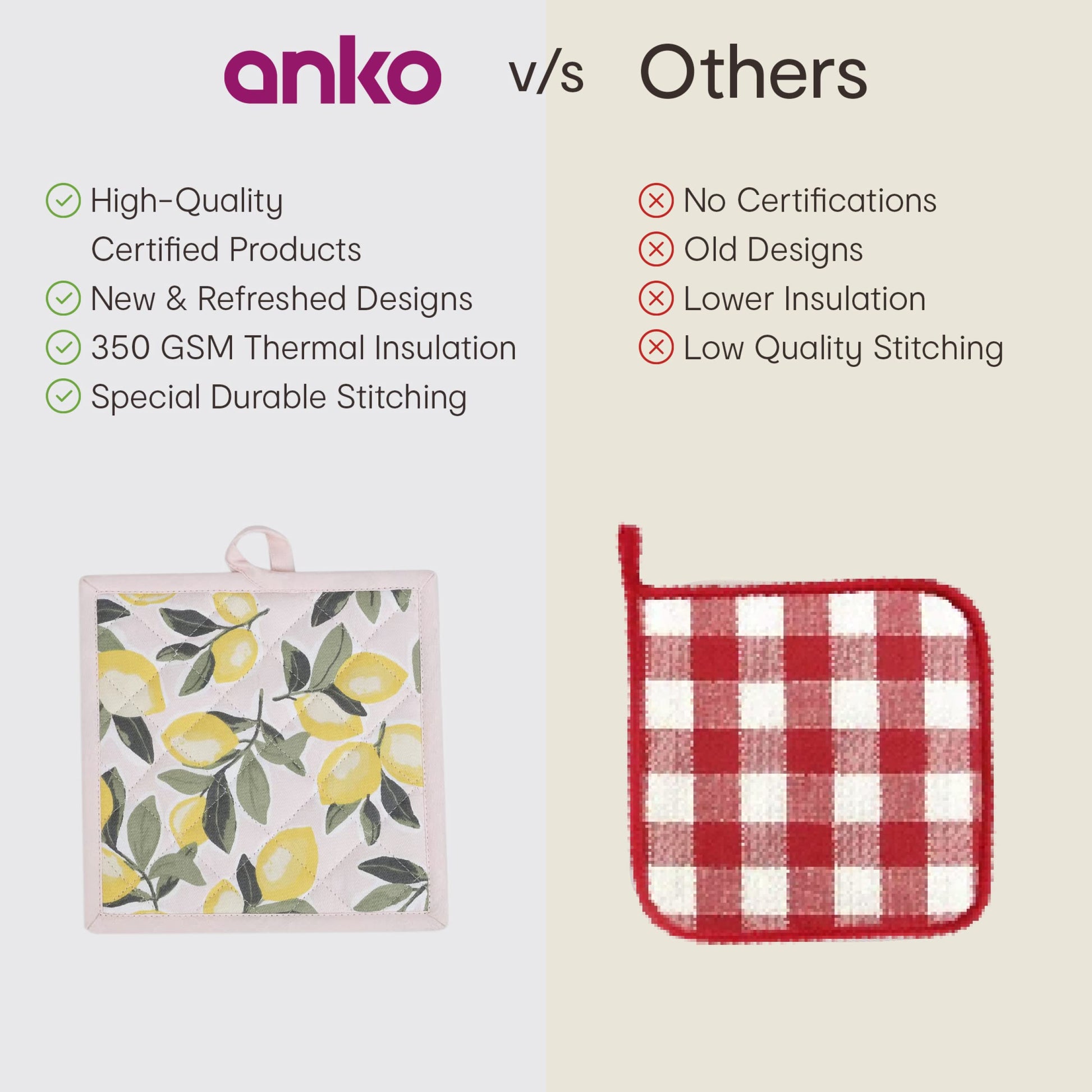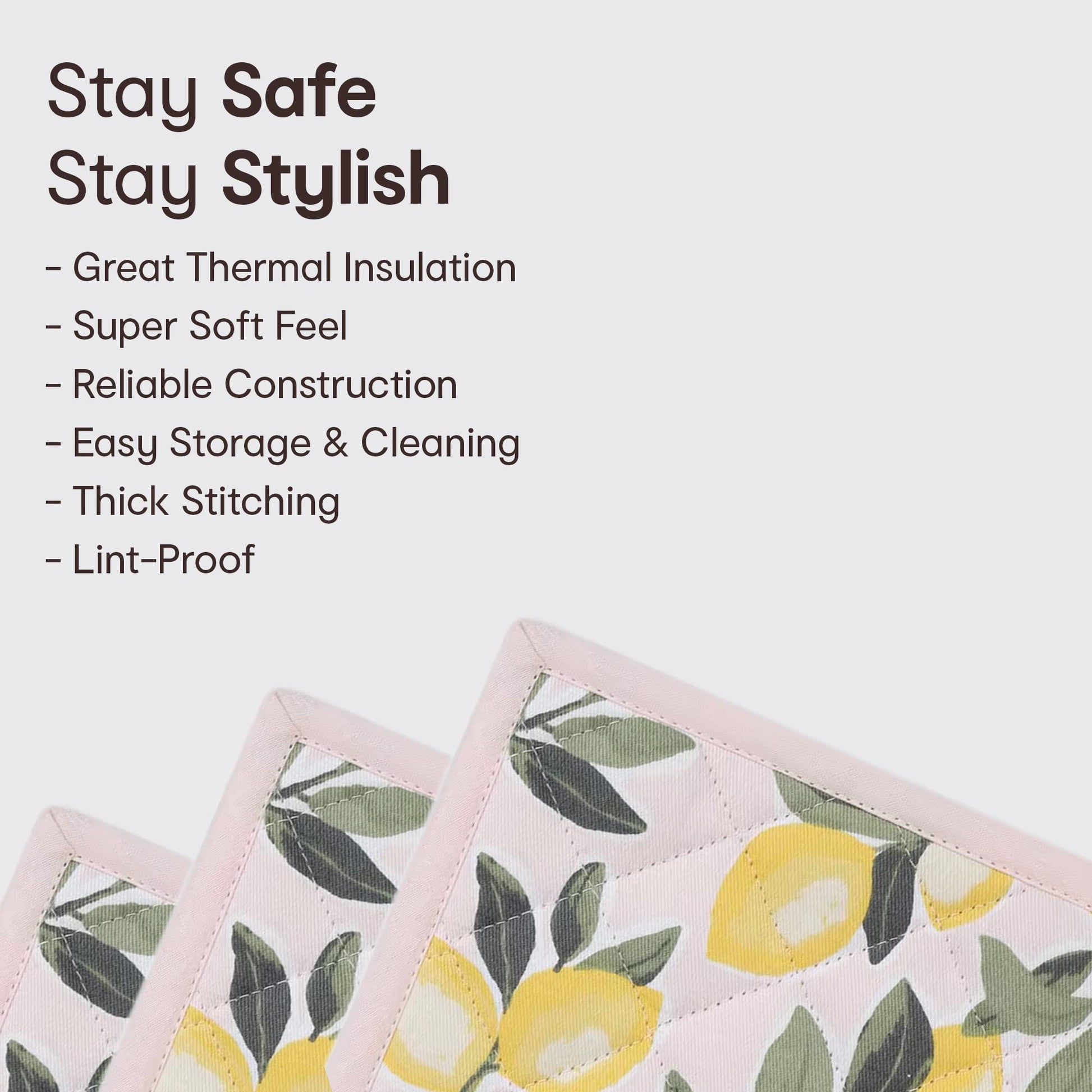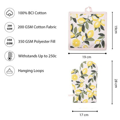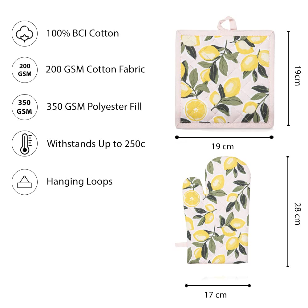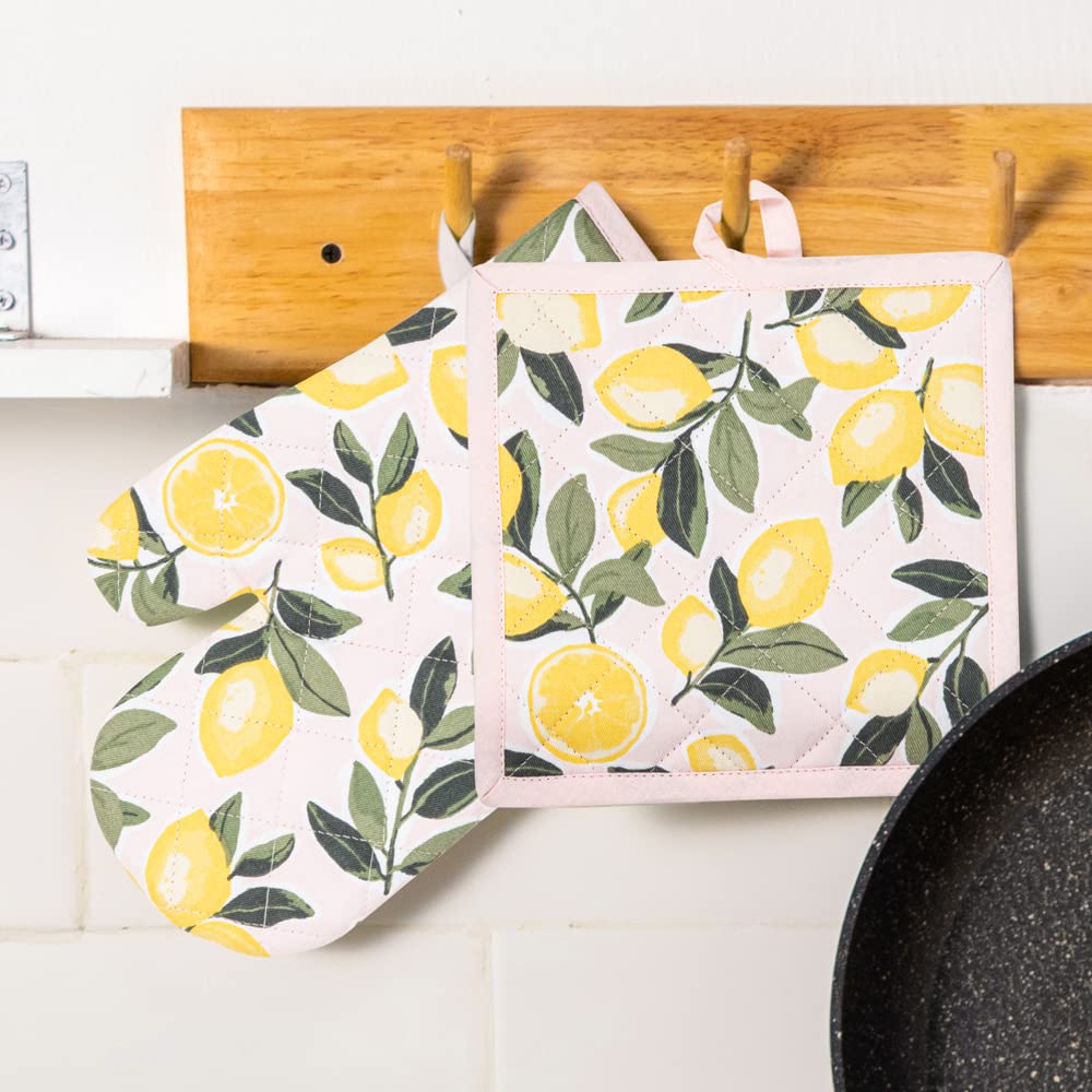 Enhance your kitchen atmosphere and experience the perfect blend of style and functionality with the Anko 100% Cotton Lemons Pot Holder Combo!
