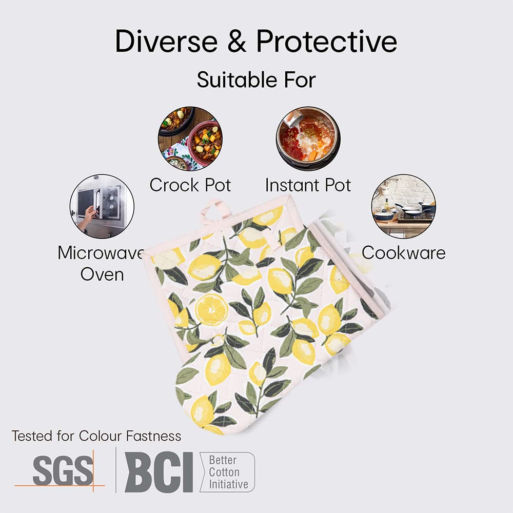 Set of 2: Cotton Lemon Print Oven Gloves | Heat Resistant & Pot Holder Included | Glove: 11" | Yellow