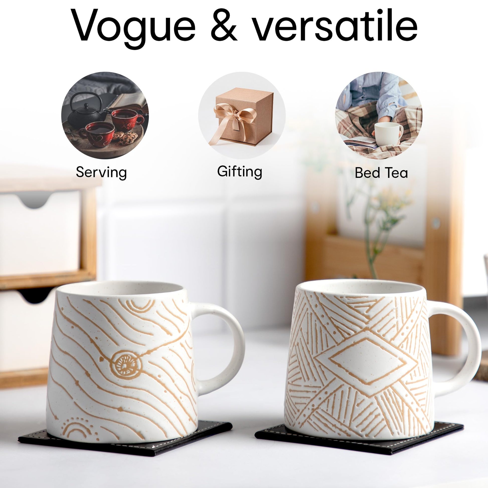 Waluvin Set of 2: Stylish White & Beige Stoneware Mugs | 400ml | Embossed Design