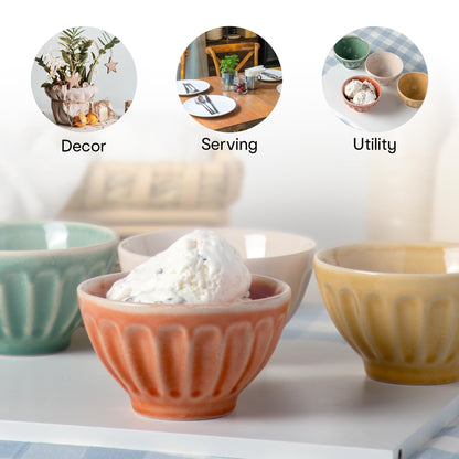Hand Glazed Icecream Bowls - Set of 4 | Stoneware Embossed Oven Safe Dessert Cup for Serving Sundaes, Sweets, Snacks, Fruits, Pudding, Nuts or Dip| 7.5 (H) x 13cm (Dia) | Pink, Brown, Green, Red