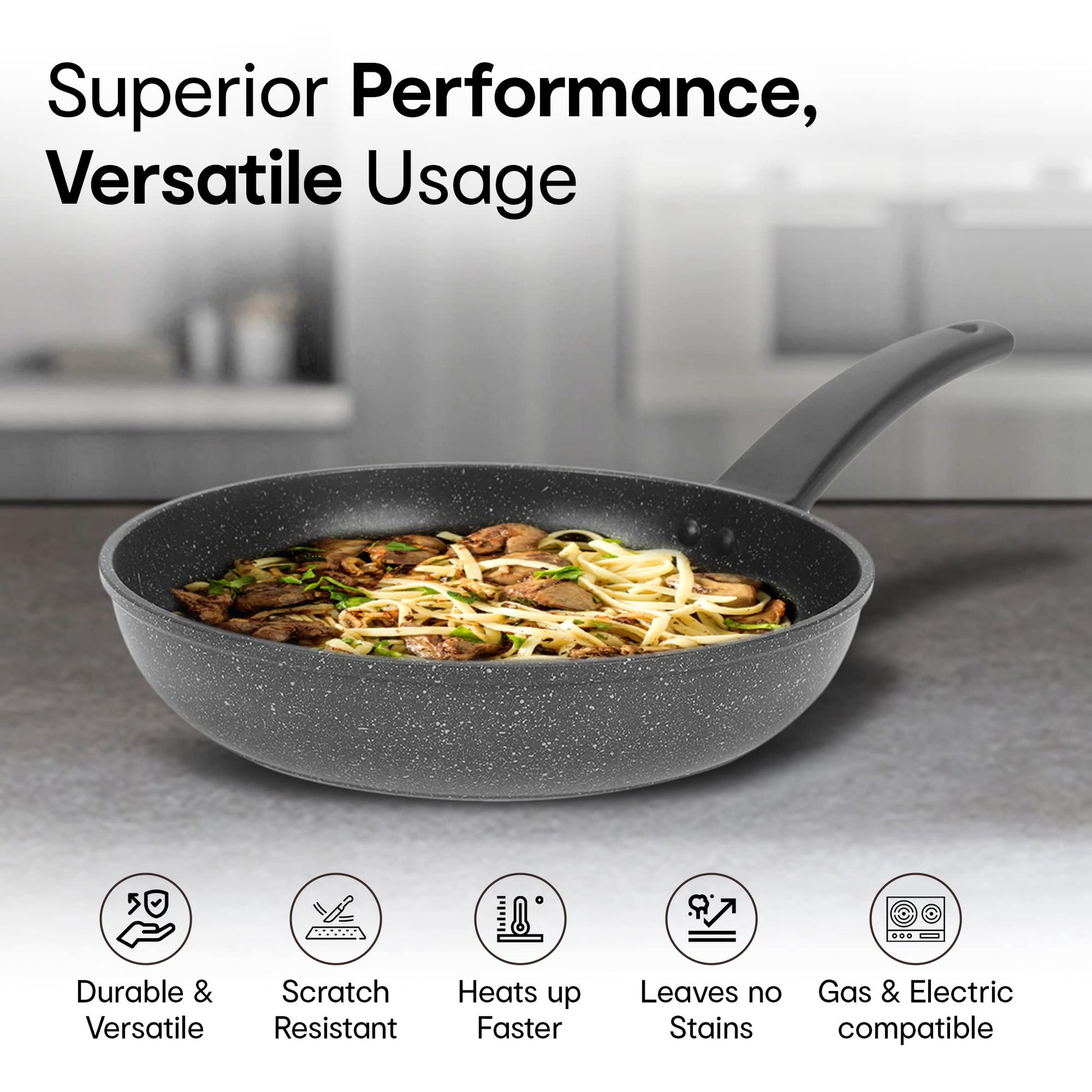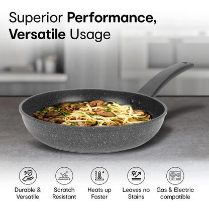 • Superb Durability: Crafted from heavy-grade aluminum, the frying pan promises long-lasting performance and strength.