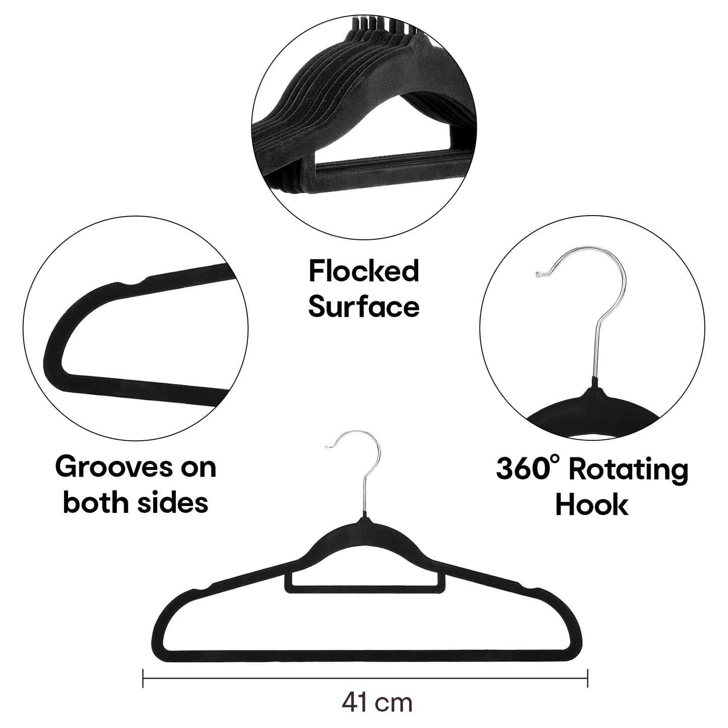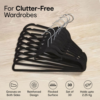 Set of 30: Velvet Hangers - Non-Slip, Reinforcement Bar | Metal Hook, Grooves | 23.5cm(H) x 41cm(W) | Black