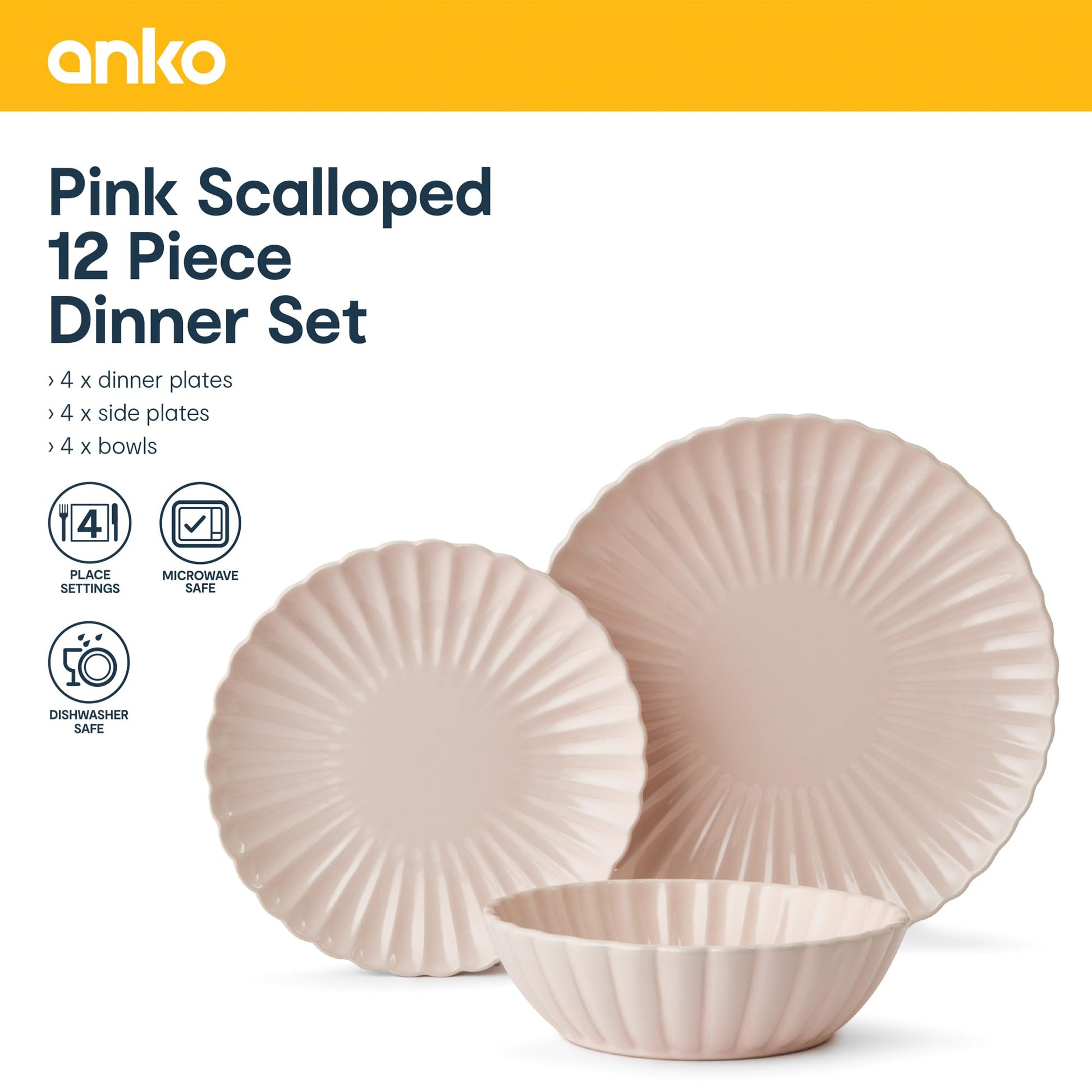 Scalloped 12 Pieces Solid Dinner Set|Premium Crockery For Dining Table|Lead & Cadmium Free,Microwave & Dishwasher Safe|Stoneware|Scalloped Design|4 Dinner Plates,4 Side Plates,4 Bowls|Pink