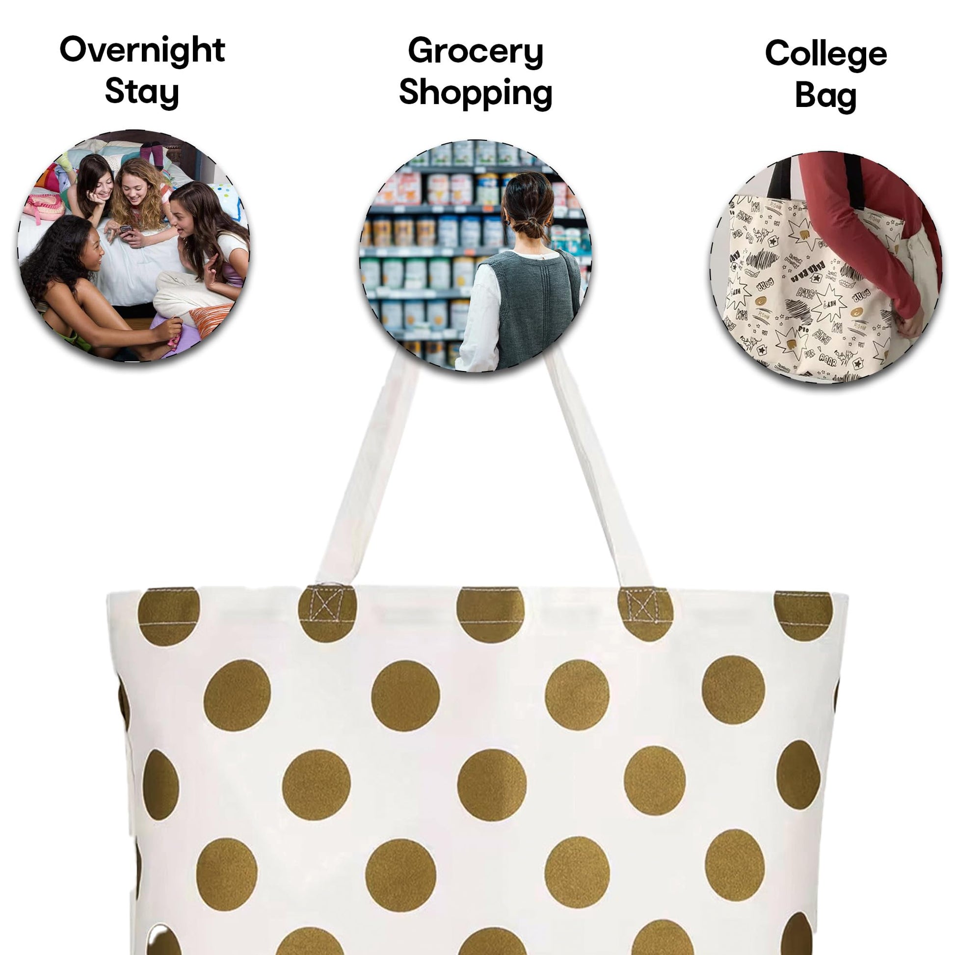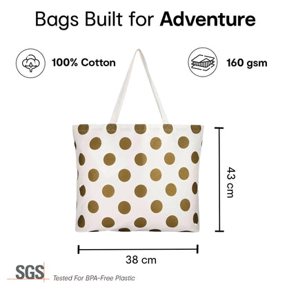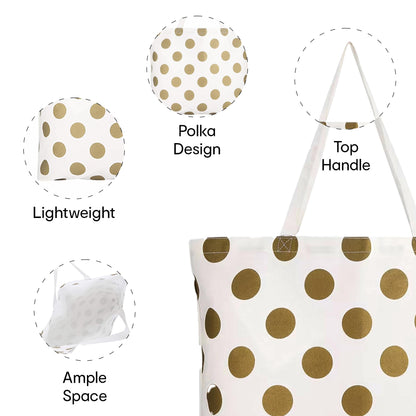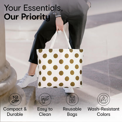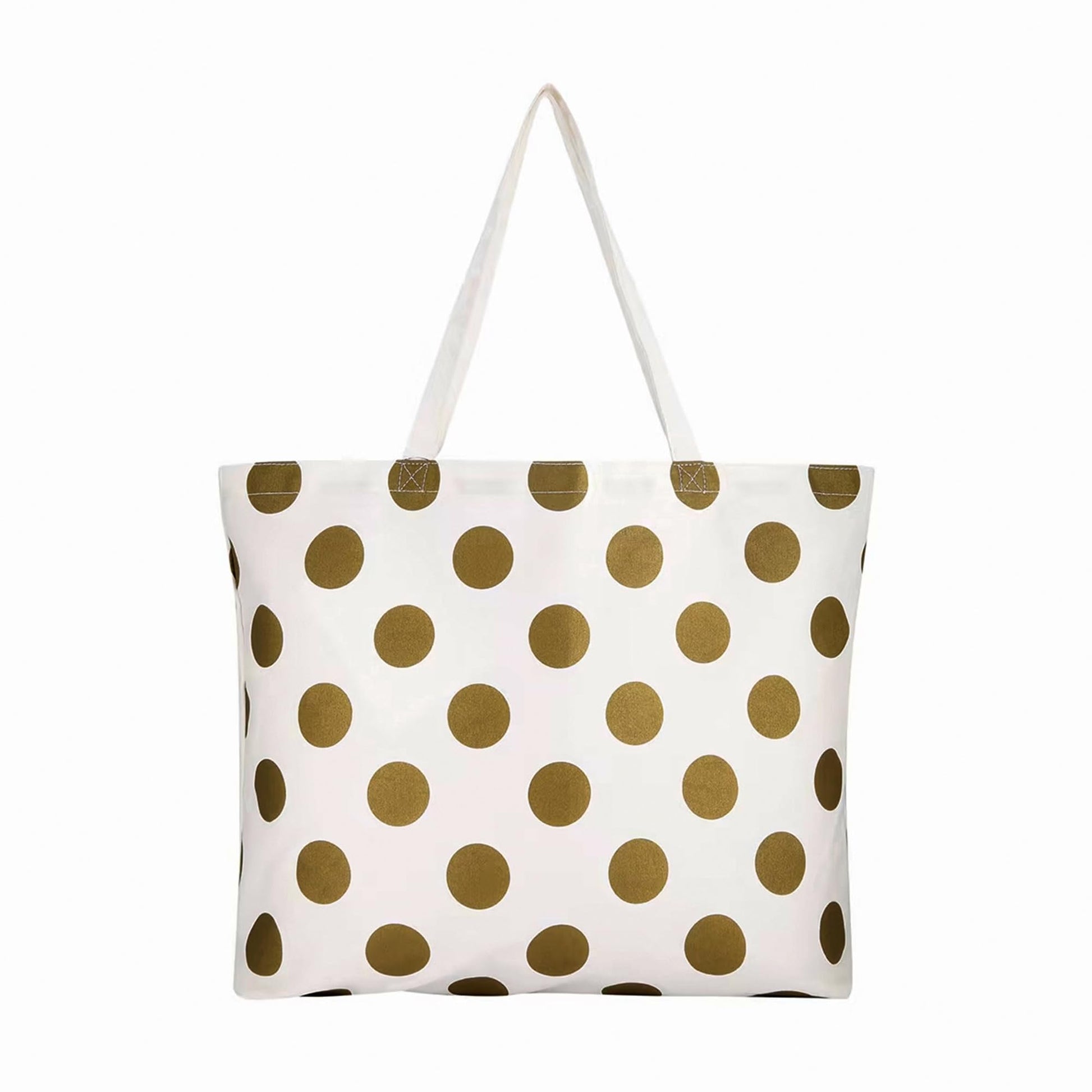 Featuring a unique spot design on cream and gold canvas, this bag not only serves as a practical shopping companion but also adds a fashionable touch to your outings.