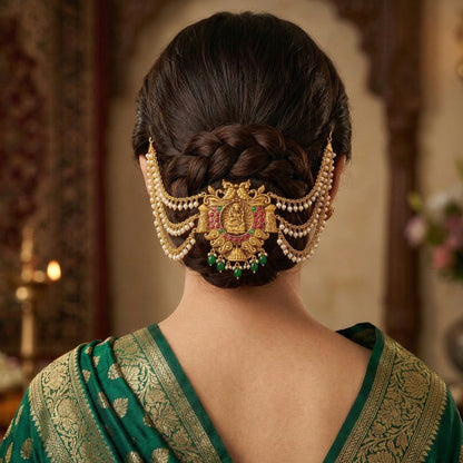 Introducing the Multicolor Temple Style Bridal Juda Pin by Yellow Chimes, your perfect hair accessory for weddings and festive occasions. This beautifully crafted juda pin features an intricate design, showcasing a stunning red and green kundan stone centerpiece adorned with cascading multi-strand pearl chains. With a length of 34 cm and a width of 6.5 cm, this gold-plated accessory adds a regal touch to any bridal attire.