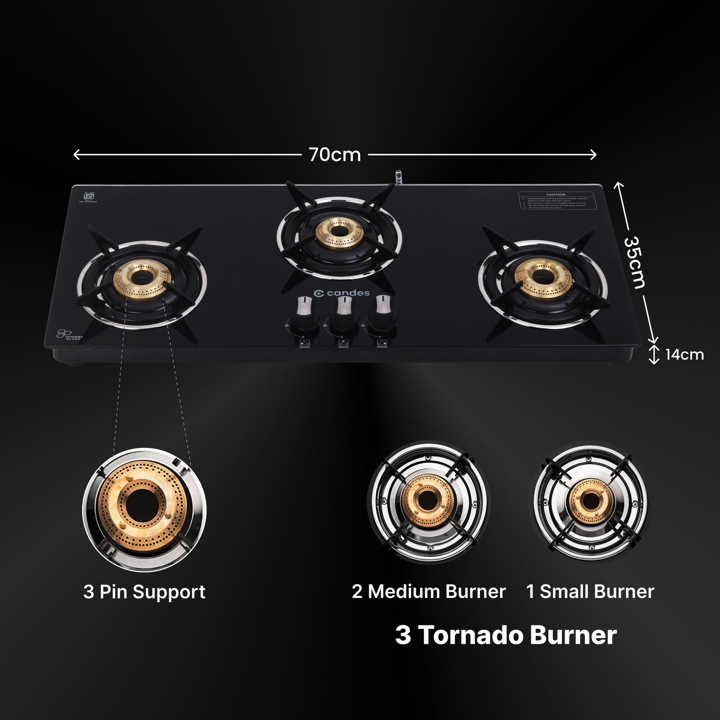 Candes Gas Stove 3 Burners Hobtop Manual Ignition | 3 Burner Gas Stove with Premium Brass Plated Burners | 6mm Toughened Glass Gas Chulha 3 Burner | LPG Compatible | ISI Certified | 1 Yr Warranty