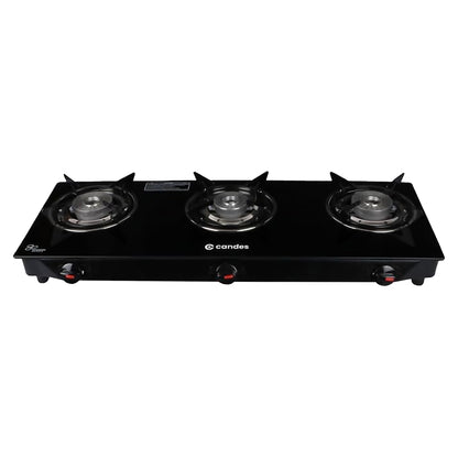 Candes 3 Burner Gas Stove: Manual Ignition with Tornado Burners | 6mm Glass | Black