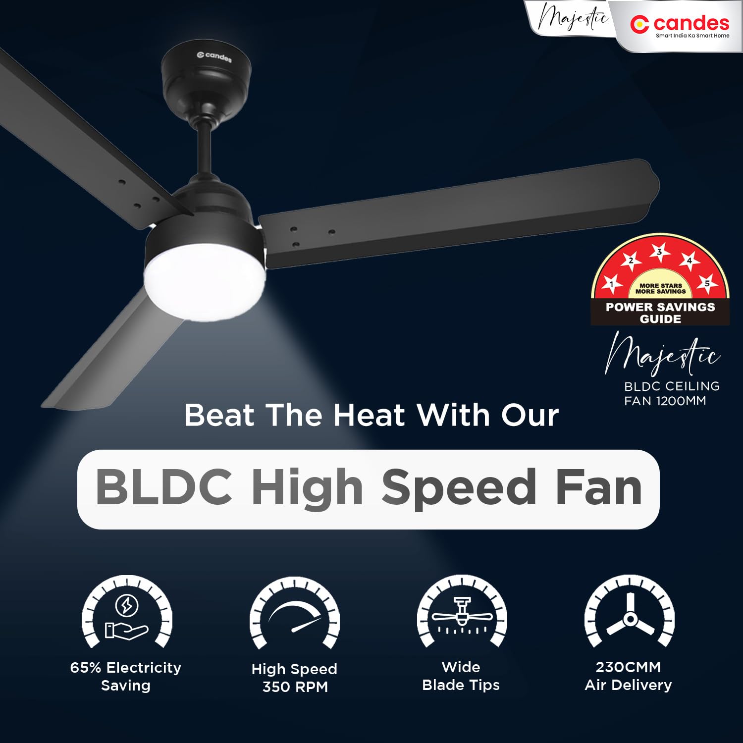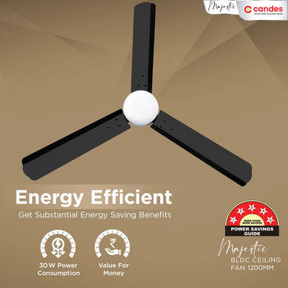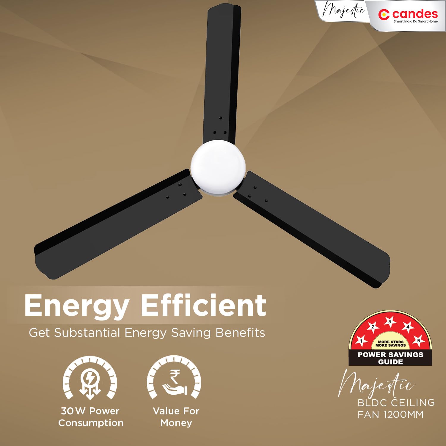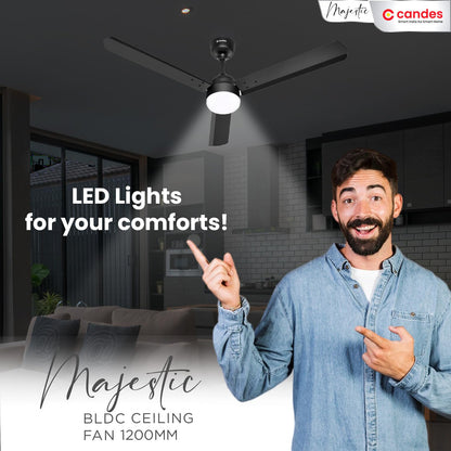 Candes Majestic BLDC LED Light Ceiling Fan 1200mm / 48 inch | BEE 5 Star Rated, Upto 65% Energy Saving, High Air Delivery & High Speed Ceiling Fans for Home | 2+1 Years Warranty (Jet Black)