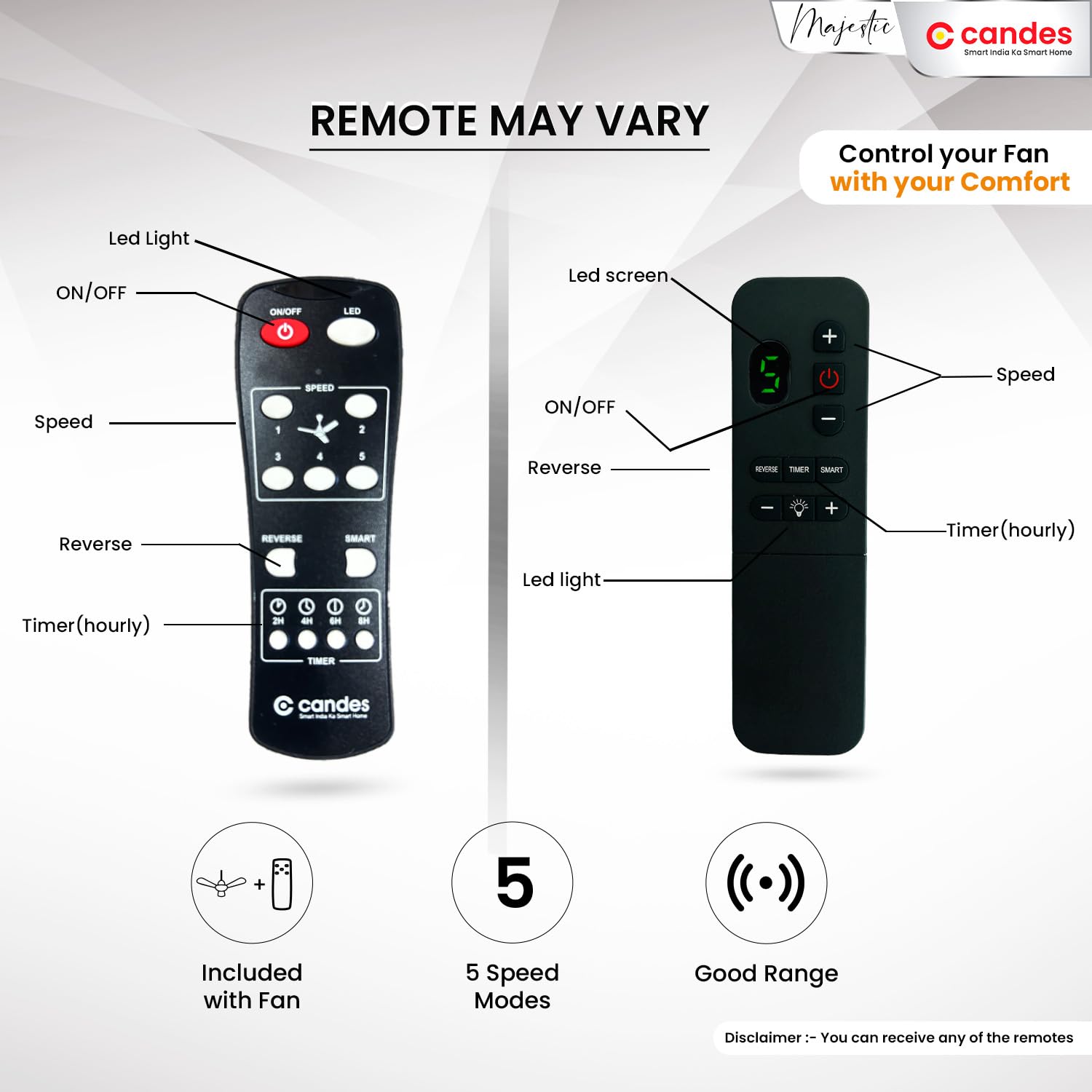 Introducing the Candes Majestic BLDC LED Light Ceiling Fan by Candes, your ultimate cooling solution for any space. With a generous 1200mm (48 inch) blade span and sleek Jet Black finish, this ceiling fan is designed to enhance the aesthetics of your home while providing powerful air circulation. The fan comes with a remote control for your convenience, ensuring you can comfortably adjust settings from anywhere in the room.