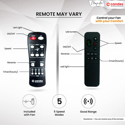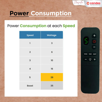 Introducing the Candes Majestic BLDC LED Ceiling Fan by Candes, your perfect solution for efficient cooling and elegant design. With a size of 1200mm (48 inch) and featuring a sleek Wooden finish, this ceiling fan is an ideal addition to any room in your house. It combines stunning aesthetics with 3 energy-efficient blades designed for optimal airflow and comfort. Whether you're enhancing a living room, bedroom, or kitchen, the Candes Majestic ensures you stay cool while elevating your décor.