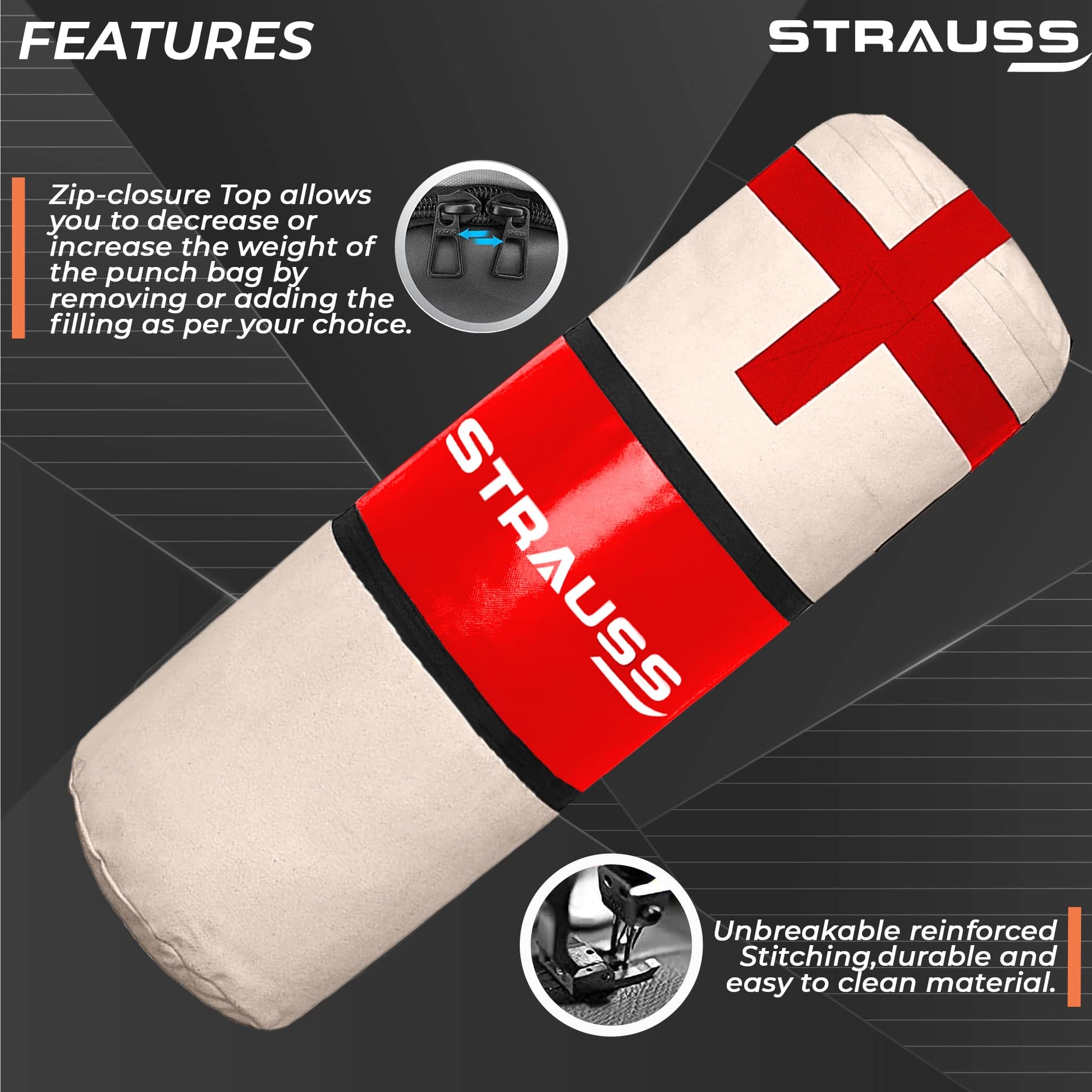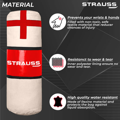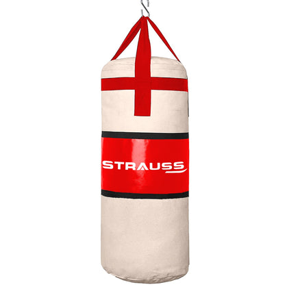 Strauss Canvas Heavy Duty Filled Gym Punching Bag|Hanging S Hook, Zippered Top Head Closure,Heavy Straps |Ideal for Boxing, MMA, Muay Thai|Boxing Bag for Home Gym & Fitness Training|2 Feet,(Cream/Red)