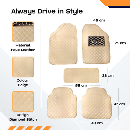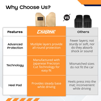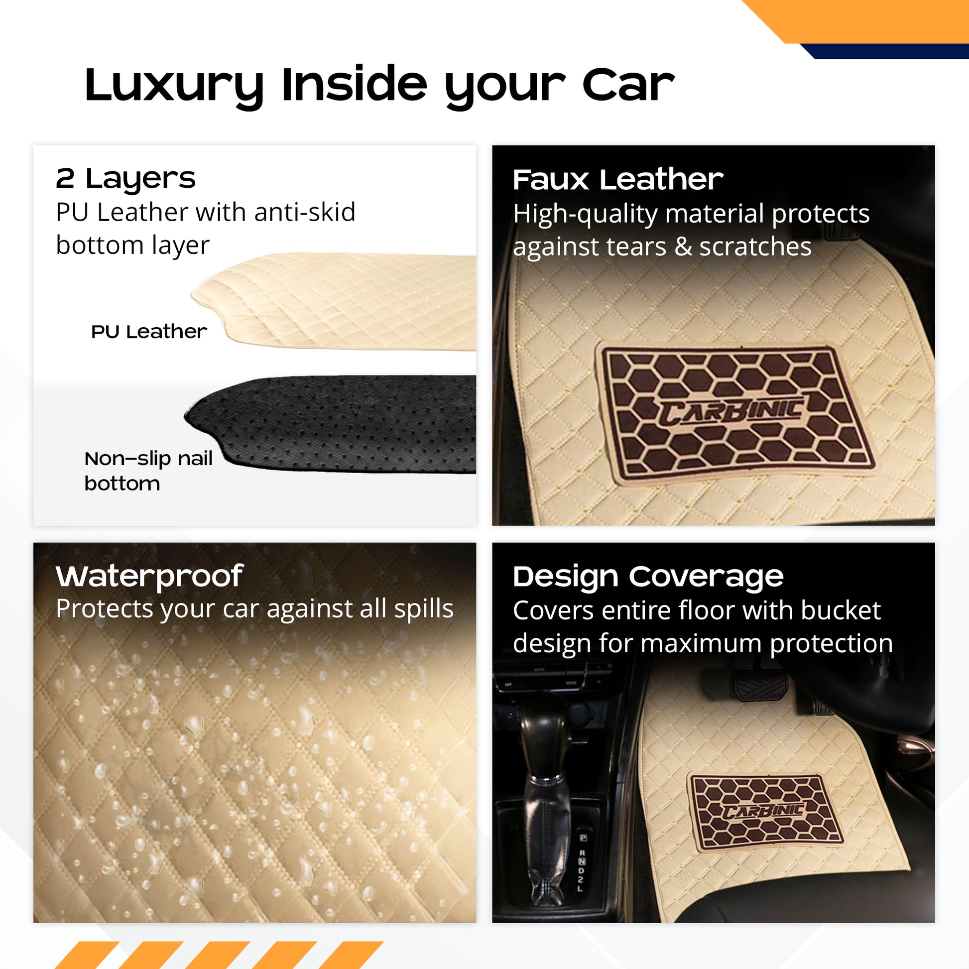 Introducing the CARBINIC 4D Car Mats, a set of 5 premium double-layered car foot mats designed for a universal fit. Made from top-quality PU leather, these mats provide not only luxurious aesthetics but also exceptional functionality. The classic beige color complements the interior of various vehicle models, including Verna, Swift, Honda City, and many more.
