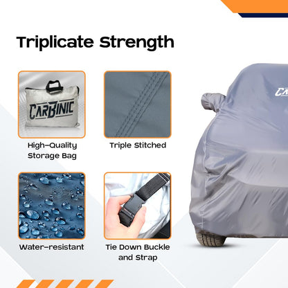 Introducing the CARBINIC Car Body Cover for KIA Sonet 2020, your vehicle's best defense against the elements. This custom-fit cover is designed to provide unparalleled protection with its high-quality Polyester Taffeta material. Its water-resistant, heat-resistant, and scratch-proof features ensure your car remains in pristine condition, while the sleek grey color adds a touch of elegance.