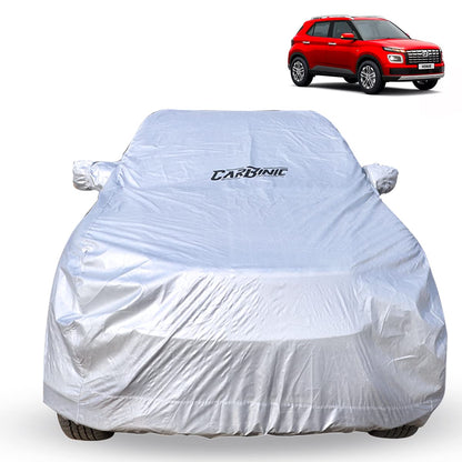CARBINIC Car Body Cover for Hyundai Venue 2019 | Water Resistant, UV Protection Car Cover | Scratchproof Body Shield | Dustproof All-Weather Cover | Mirror Pocket & Antenna | Car Accessories, Silver