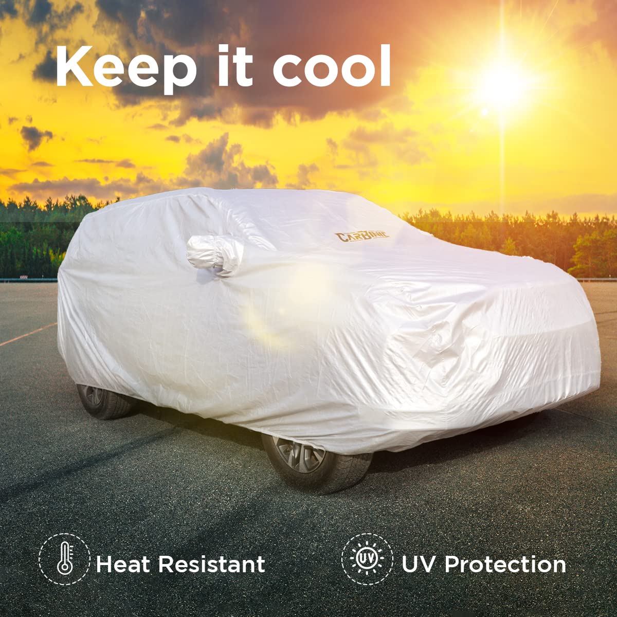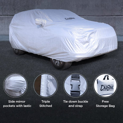 CARBINIC Car Cover for Mahindra Scorpio N 2022 Waterproof (Tested) and Dustproof Custom Fit UV Heat Resistant Outdoor Protection with Triple Stitched Fully Elastic Surface (Silver)