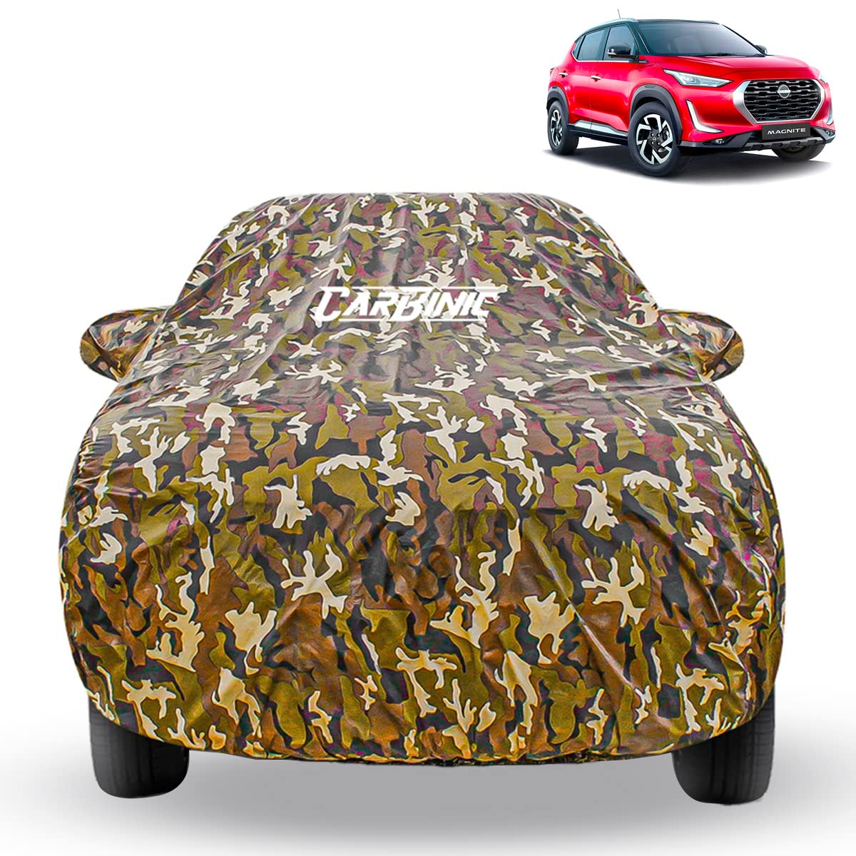 CARBINIC Car Cover for Nissan Magnite 2022 Waterproof (Tested) and Dustproof Custom Fit UV Heat Resistant Outdoor Protection with Triple Stitched Fully Elastic Surface | Jungle with Pockets (Jungle)