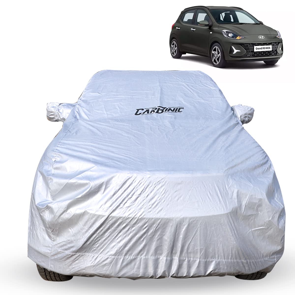CARBINIC Waterproof Car Body Cover for Hyundai Grand i10 | Dustproof, UV Proof Car Cover | i10 Car Accessories | Mirror Pockets & Antenna Triple Stitched | Double Layered Soft Cotton Lining, Silver