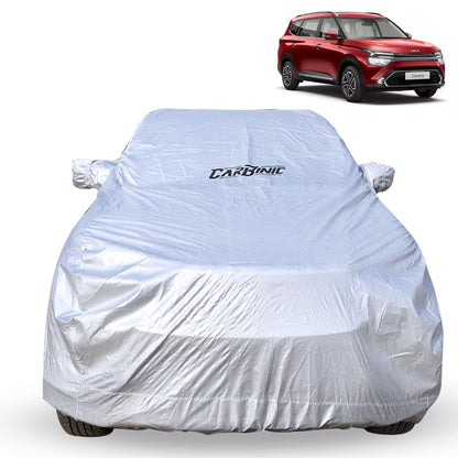 CARBINIC Waterproof Car Body Cover for KIA Carens 2022 | Dustproof, UV Proof Car Cover | Carens Car Accessories | Mirror Pockets & Antenna Triple Stitched | Double Layered Soft Cotton Lining, Silver