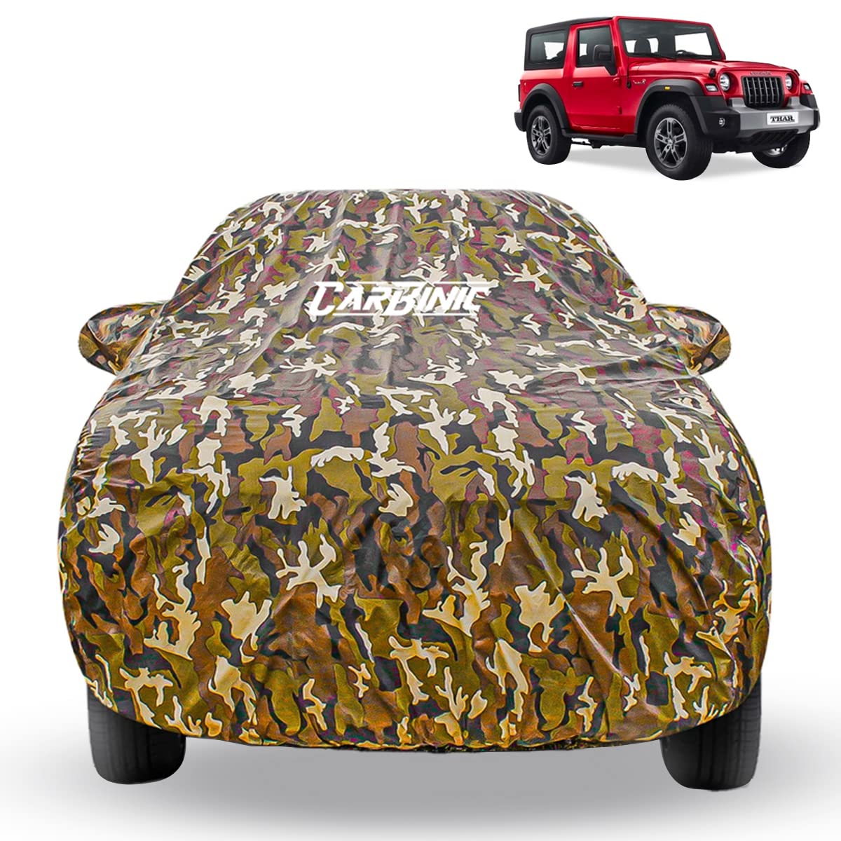 CARBINIC Waterproof Car Body Cover for Mahindra Thar 2020 | Dustproof, UV Proof Car Cover | Thar Car Accessories | Mirror Pockets & Antenna Triple Stitched | Double Layered Soft Cotton Lining, Jungle