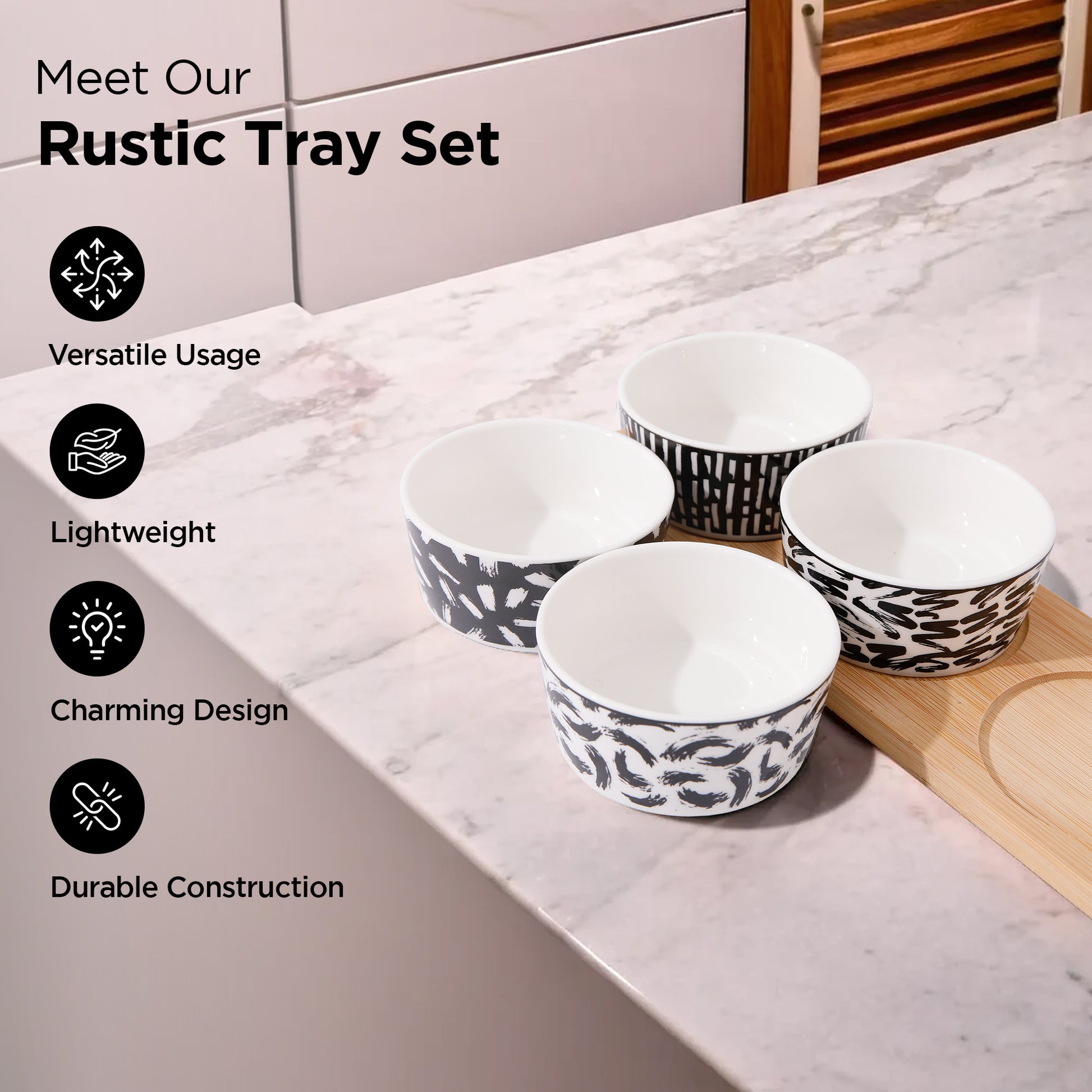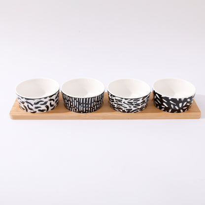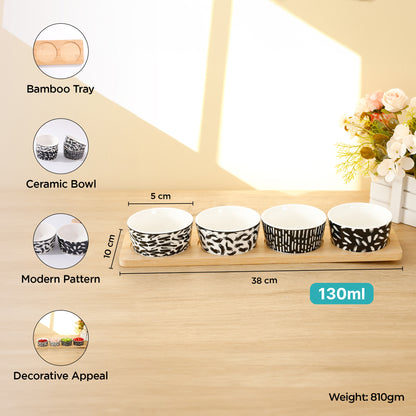 Ceramic Serving Bowls Set of 4: Microwave Safe with Bamboo Tray | 130ml each | Black & White