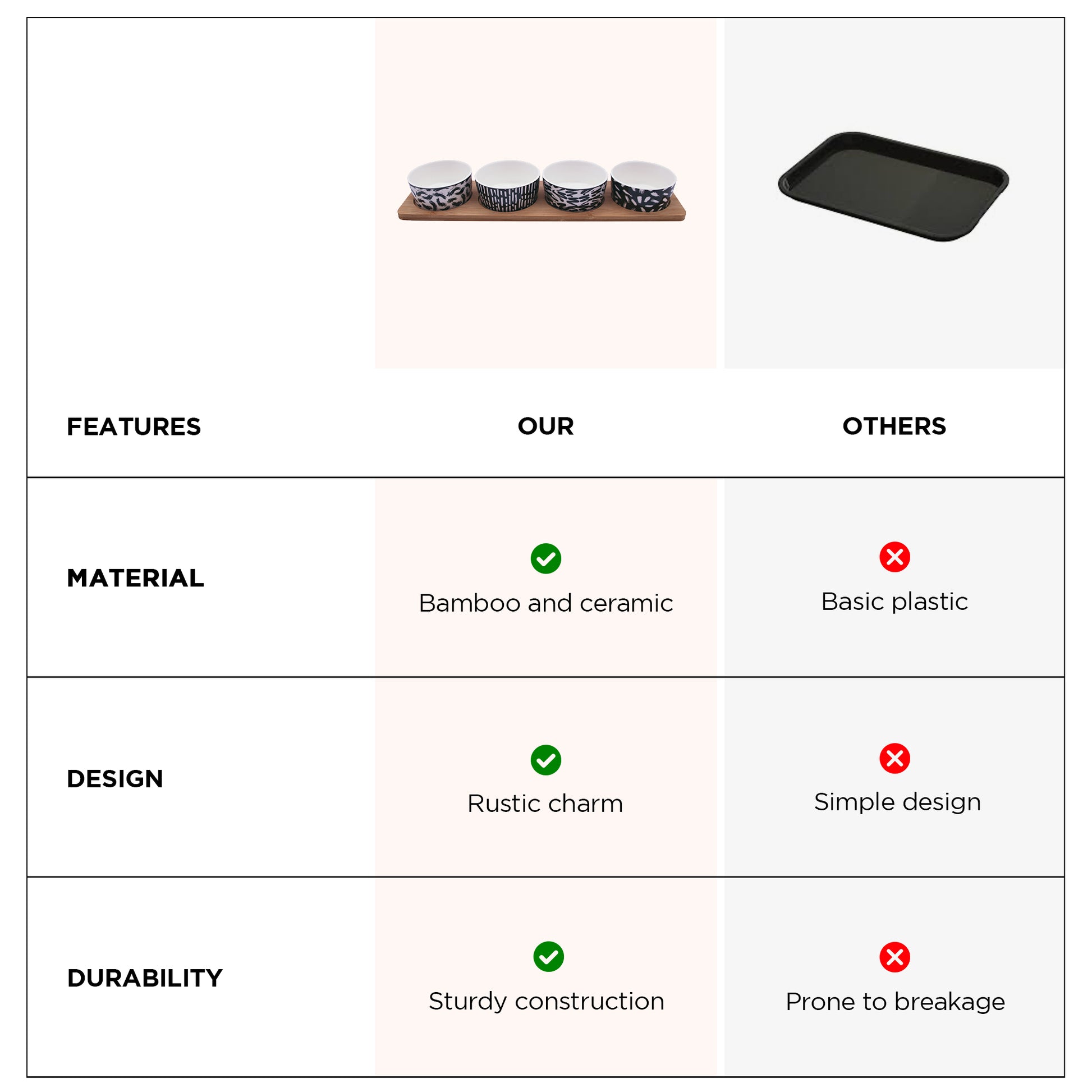 • ELEGANT DESIGN: Chic black and white ceramic bowls (8.5cm diameter) paired with a stylish bamboo tray that enhances any dining space.