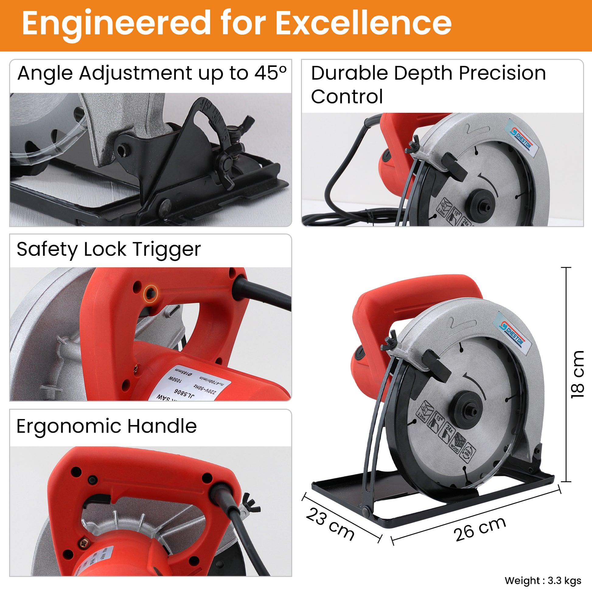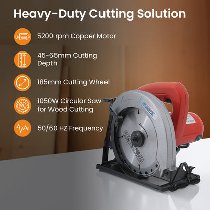 1050W Circular Saw For Wood Cutting 185mm / 7 inch | 5200 RPM Copper Motor | 45-65 mm Cutting Depth | Durable Depth Precision Control