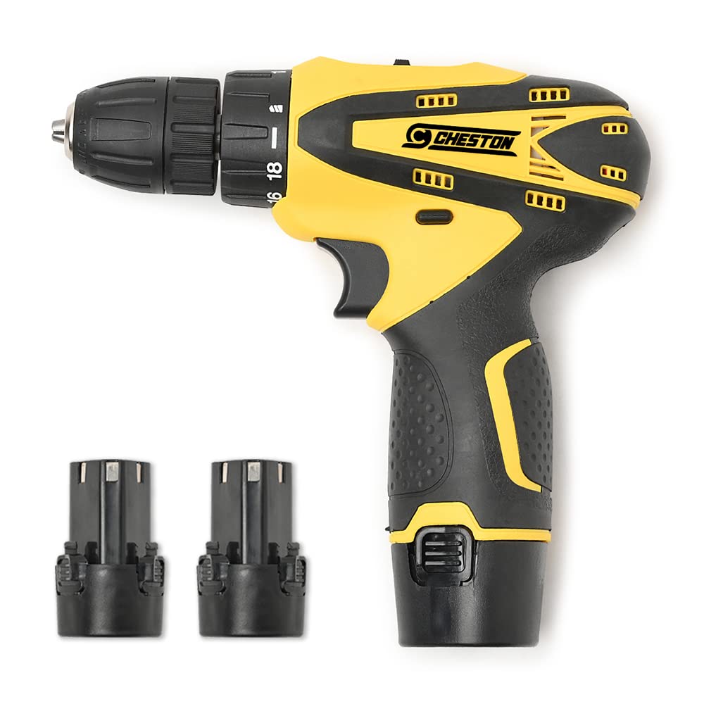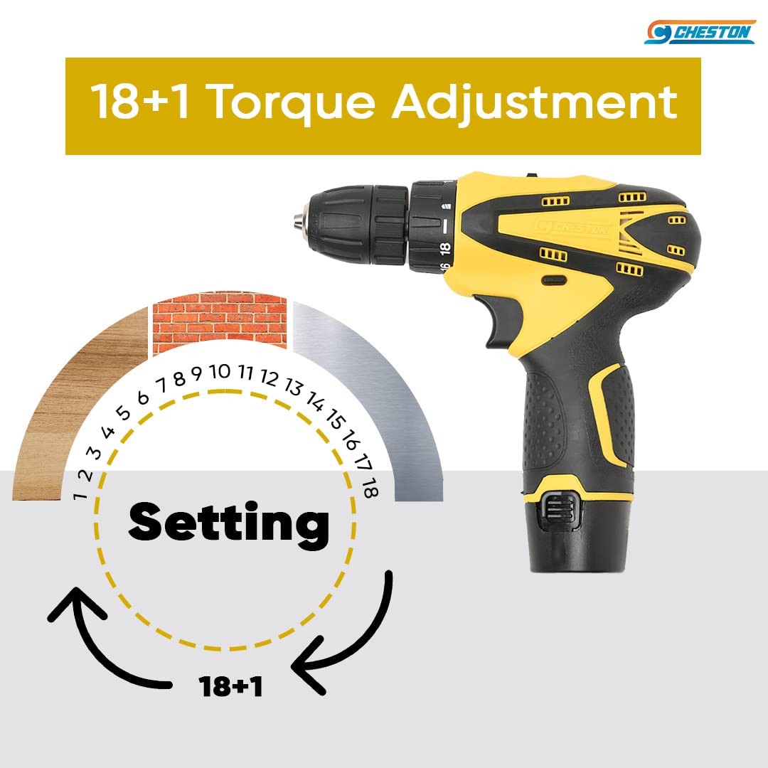 Cheston 10 millimeters Dual Speed Keyless Chuck 12V Cordless Drill/Screwdriver with 2 Batteries, LED Torch Variable Speed and Torque Setting (19+1) - (28 L x 24 W x 7 H) - Yellow