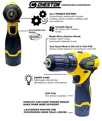Cheston drill/driver kit is great for a variety of home projects, with its lithium-ion battery pack, powerful high-performance motor, inside a compact lightweight design that improves user comfort, especially when working in tight spaces over long run times 240v wide voltage charger can withstand the instability of the voltage or sudden change. Great for working with wood, brick, metal and all other driving needs speed and torque: 2 speed transmission for screw driving and drilling variable speed(0-600 rpm) for great torque, for a wide range of drilling, driving application