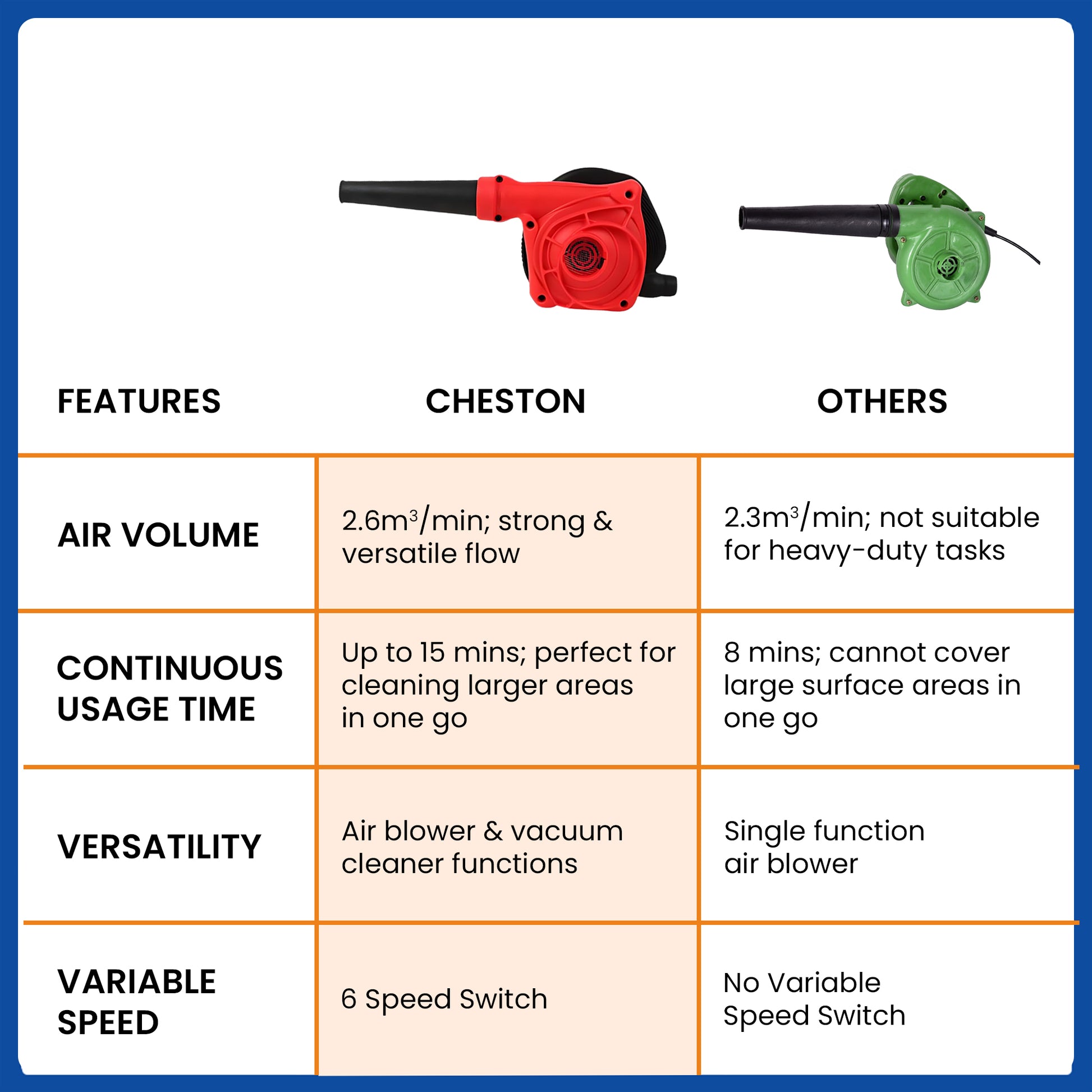 Whether you're tidying up your garage, car, or PC, the Cheston Leaf Blower adapts to your specific needs. It’s ideally suited for: