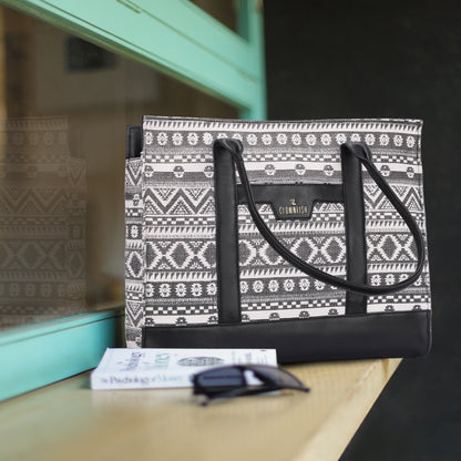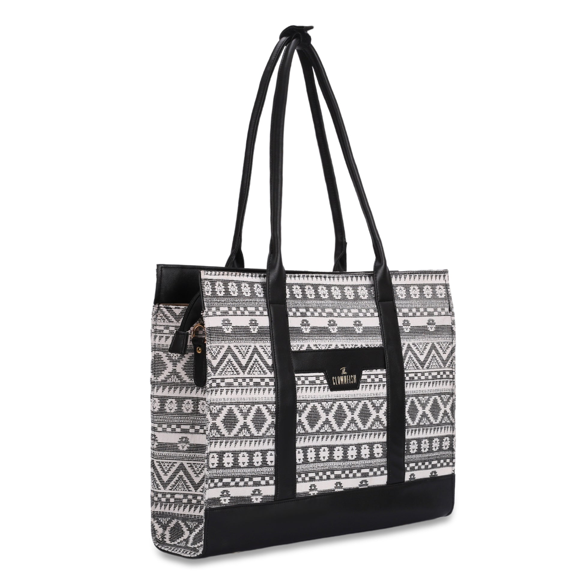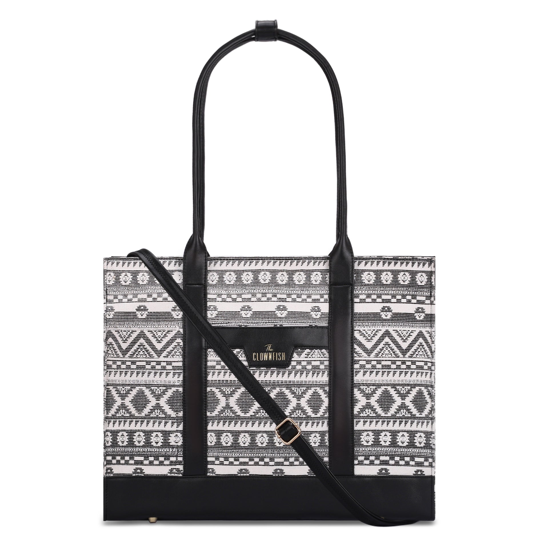 Introducing the Women's Laptop Handbag by Clownfish, designed for the modern professional. Crafted from high-quality Printed Canvas + Vegan Leather, this stylish tote showcases a Classic Chic - White & Black color that complements any outfit. With a spacious volume of 17 liters, it effortlessly accommodates your essentials, including a dedicated 15.6 Inch Laptop Sleeve for optimal laptop protection during your office use, travel, or conferences. The detachable and adjustable shoulder sling strap allows for versatile carrying options—transforming it from a handbag to a shoulder bag or a tote with ease. Featuring an inner bottle pocket and multi-level inner pockets, this bag ensures your items are organized and easily accessible. Customer satisfaction is key, and we prioritize your needs with our durable design that counteracts concerns about quality issues and insufficient padding. Ideal as a thoughtful gift for friends, mothers, or wives, this office bag for women combines functionality with chic aesthetics.