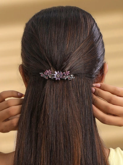 Introducing the Classic French Barrette Hair Clip by Yellow Chimes, a stunning piece designed for every woman and girl who appreciates style. This exquisite hair clip measures 7 cm x 1.7 cm and features an enchanting purple crystal floral design, suitable for all hair types. Whether it's for daily wear or a special occasion, this barrette is a must-have in your hair accessories collection.
