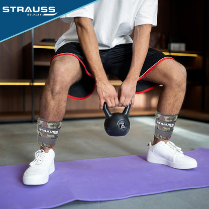 Introducing the Adjustable Ankle/Wrist Weights by Strauss Sports, designed to elevate your fitness regime. This combo includes two weights, each weighing 1.5 KG, totaling 3 KG. Made from high-quality Neoprene, these weights feature a camouflage design, making them both functional and stylish.