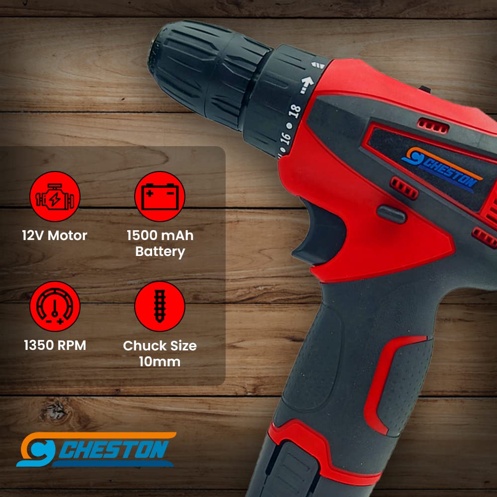 Cheston 12V 10mm Cordless Drill Machine with 2 Batteries| Variable Speed Drill Machine for Home Use LED Torch| Torque Setting (19+1) Drill Machine for Wall Drilling/Screwdriver for Home | Power Tools