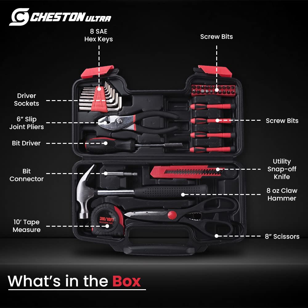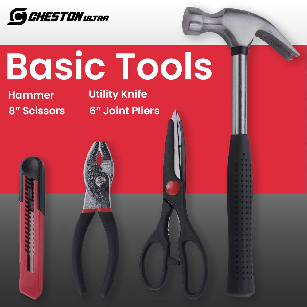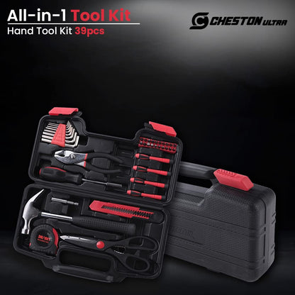 Cheston Ultra 39 Piece Hand Tool Kit | Non-Slip & Corrosion Resistant Handles | Multi-Utility Household & Professional Hand Tools | Screwdriver, Socket Set, Wrench, Pliers