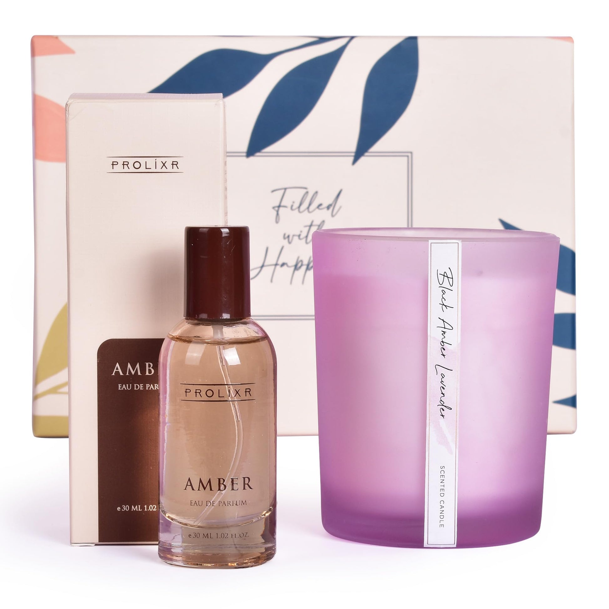 Combo: Gleevers Divine Aroma Gift Box - Amber Perfume & Lavender Candle | 30ml & 250gm | Elegant Gift Set
