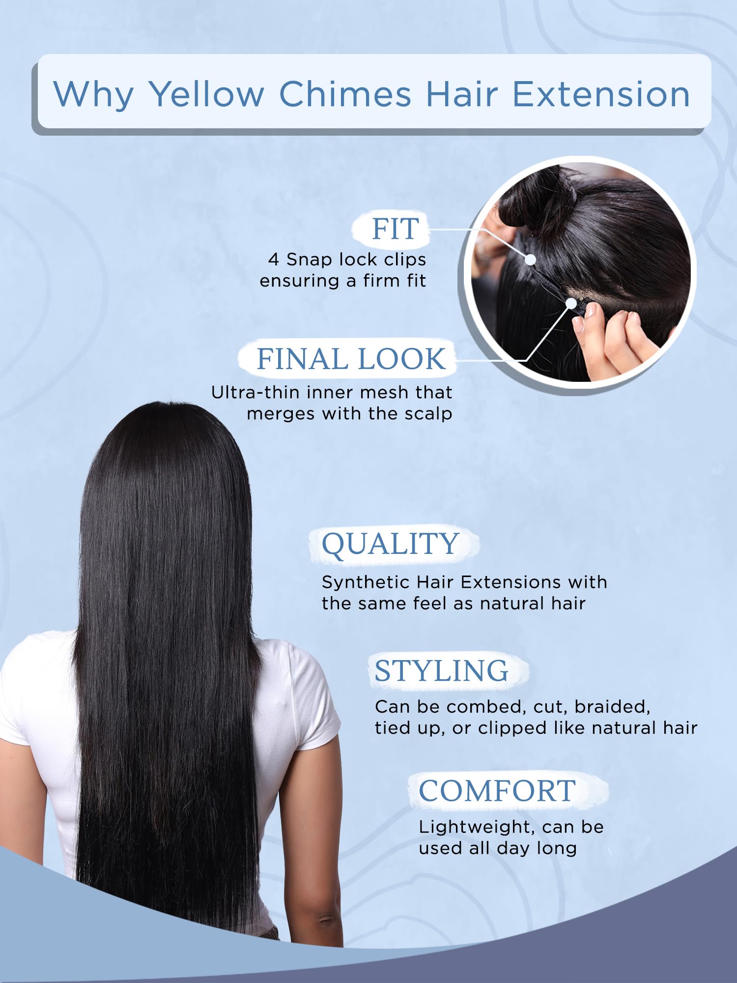 Introducing the Yellow Chimes Hair Extensions For Women, a stunning set of clip-in hair extensions designed for those looking to elevate their hairstyles with ease and glamour. This set includes 4 premium synthetic hair extensions that are 65 inches long, crafted from high-quality materials that mimic the appearance and feel of natural hair. The sleek black color is perfect for blending seamlessly with your natural hair,