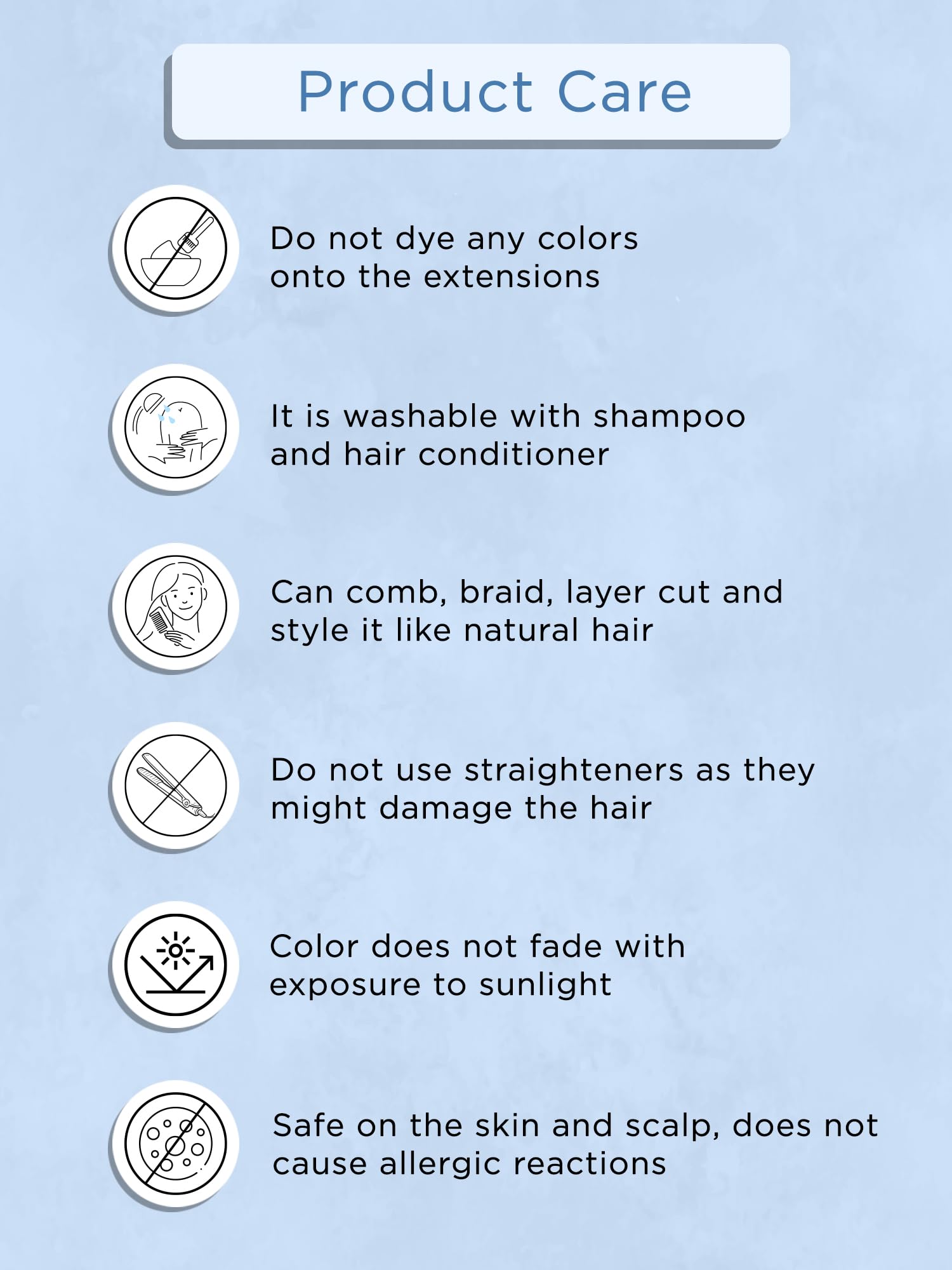 • CARES FOR YOUR HAIR: To prevent tangling, use a detangling spray or a mixture of conditioner and water for maintenance.