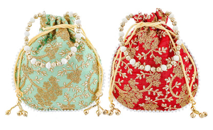 Ethnic Clutch Silk 2 Pieces Potli Batwa Pouch Bag with Beadwork Gift for Women (Maroon & Green) - CTKTC023043