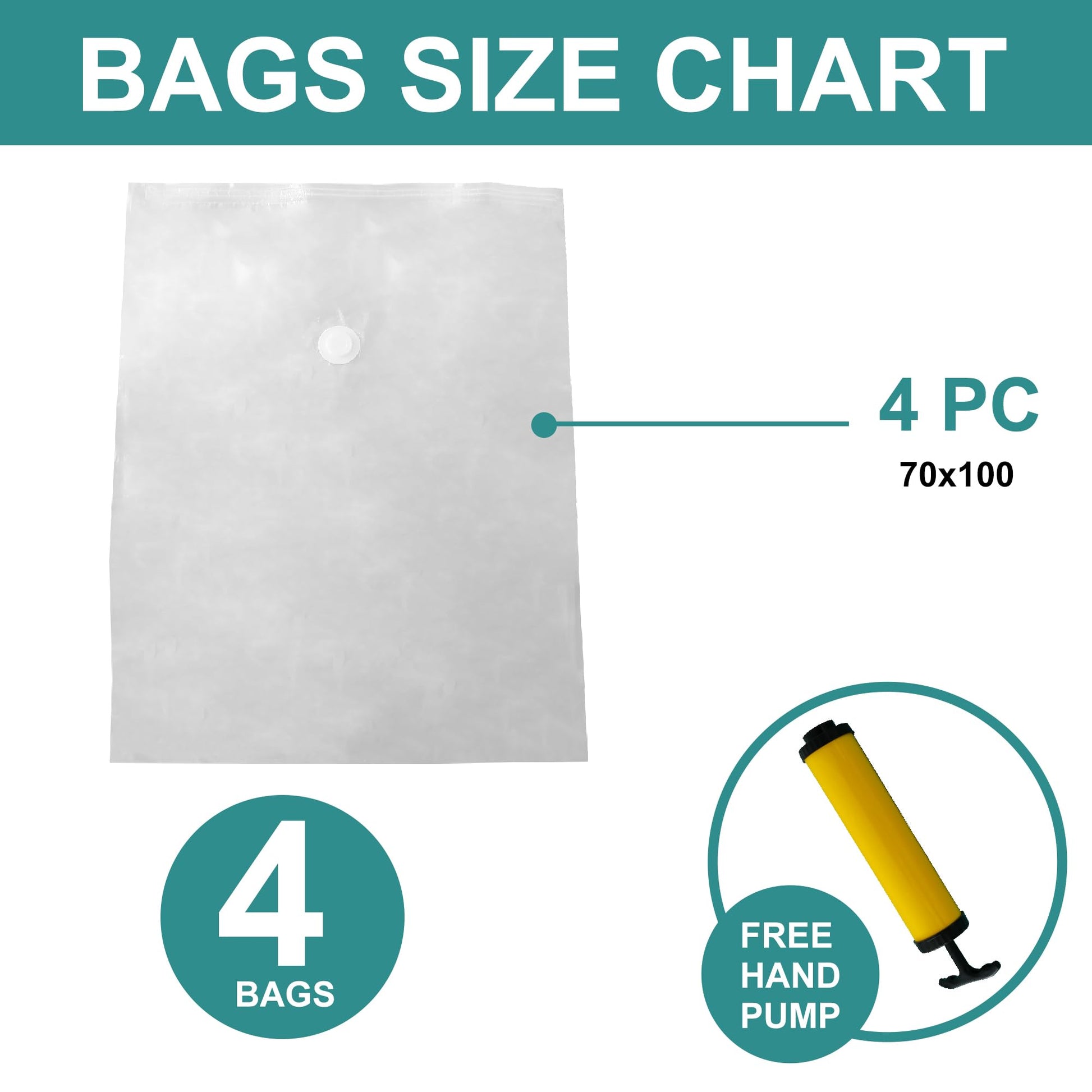 Introducing the Kuber Space Saver Vacuum Storage Bags from Kuber International, the ultimate 4-Pack of Jumbo XL (70x100 cm) reusable vacuum bags for all your travel and storage needs. Constructed from durable PE+PA material, these bags ensure your clothes, bedding, and other bulky items are protected and organized. Each pack comes with a hand pump that makes compressing easy and efficient, allowing you to maximize space in your suitcase, closet, or cupboard.