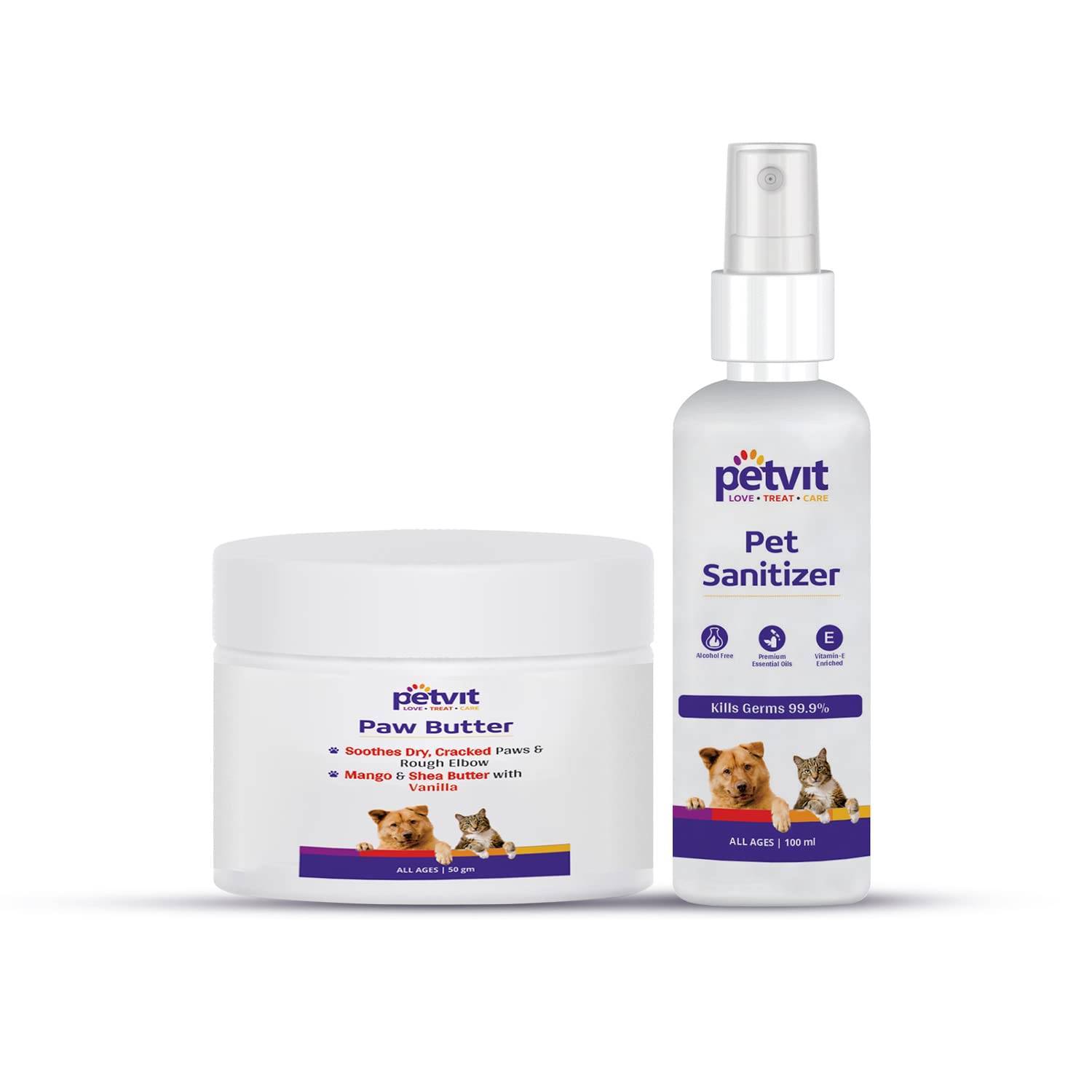 Petvit Paw Butter with Mango & Shea Butter & Lemon Grass Oil, Vitamin E, Coconut Oil – 50gm & Pet Sanitizer with Citronella Oil, Neem Oil, Eucalyptus Oil for All Breed Dog & Cat-100ml (Combo)