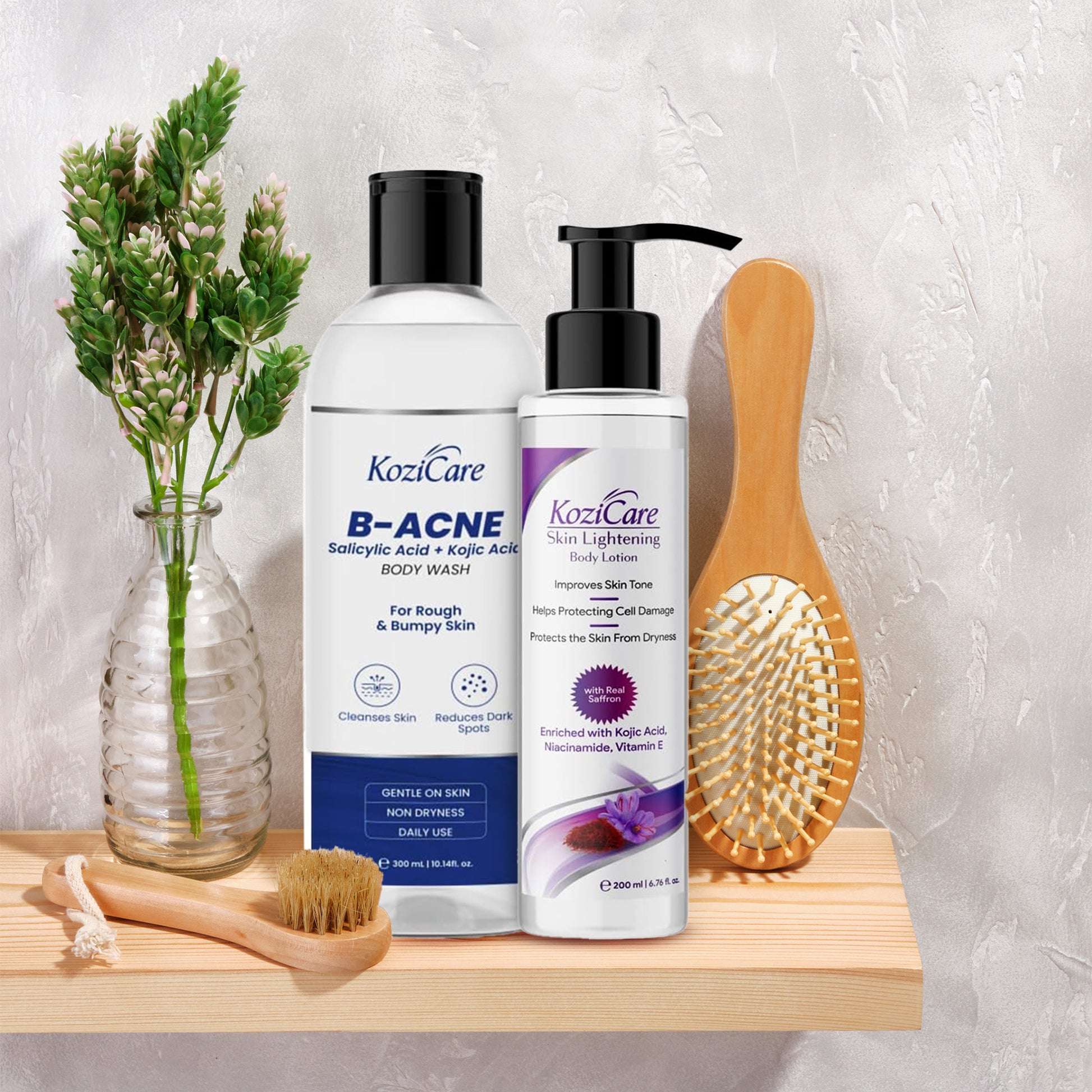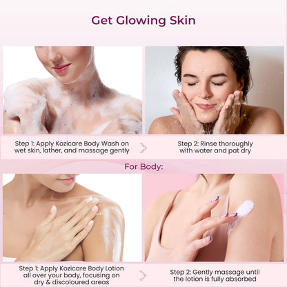 Kozicare B - Acne Body Wash & Saffron Body Lotion Combo | 2% Salicylic Acid Body Wash For Women & Men -300Ml|Tan Removal| Shea Butter Body Lotion | Niacinamide & Vitamin E Moisturizer For Body - 200Ml