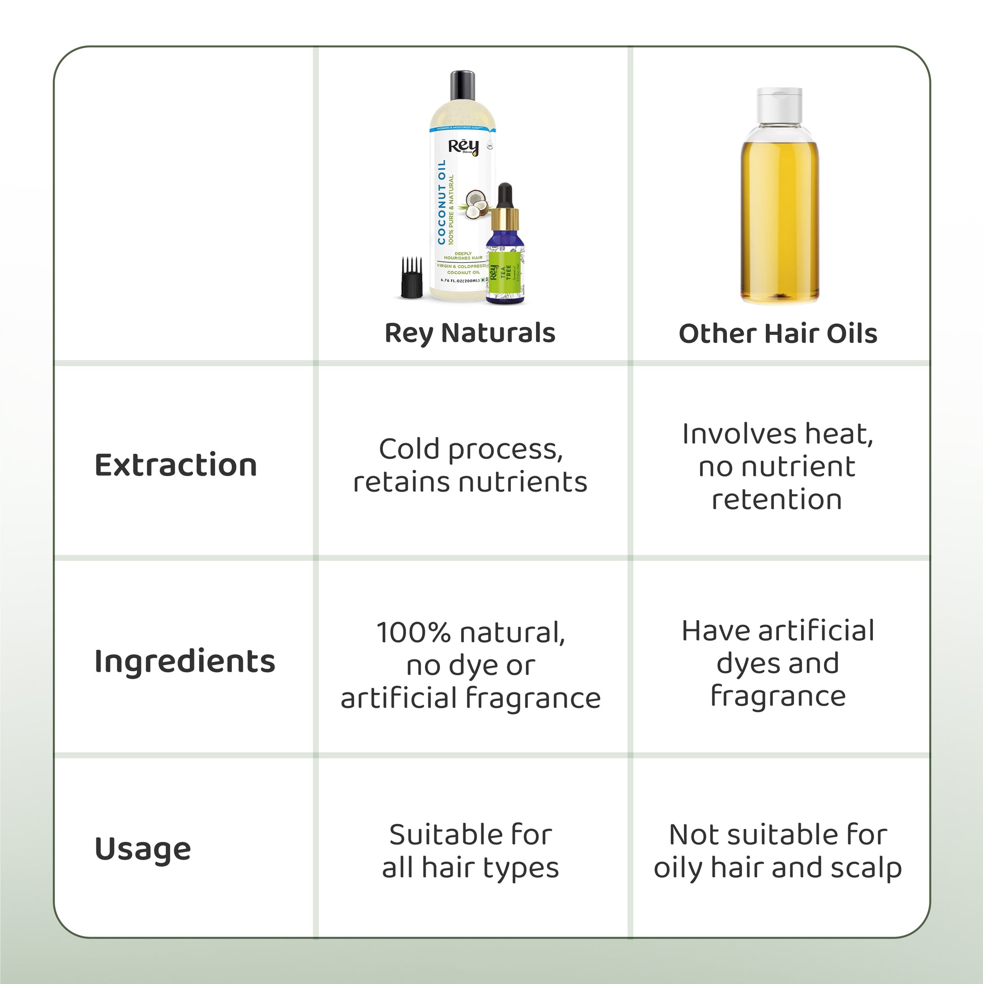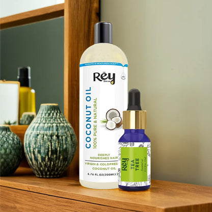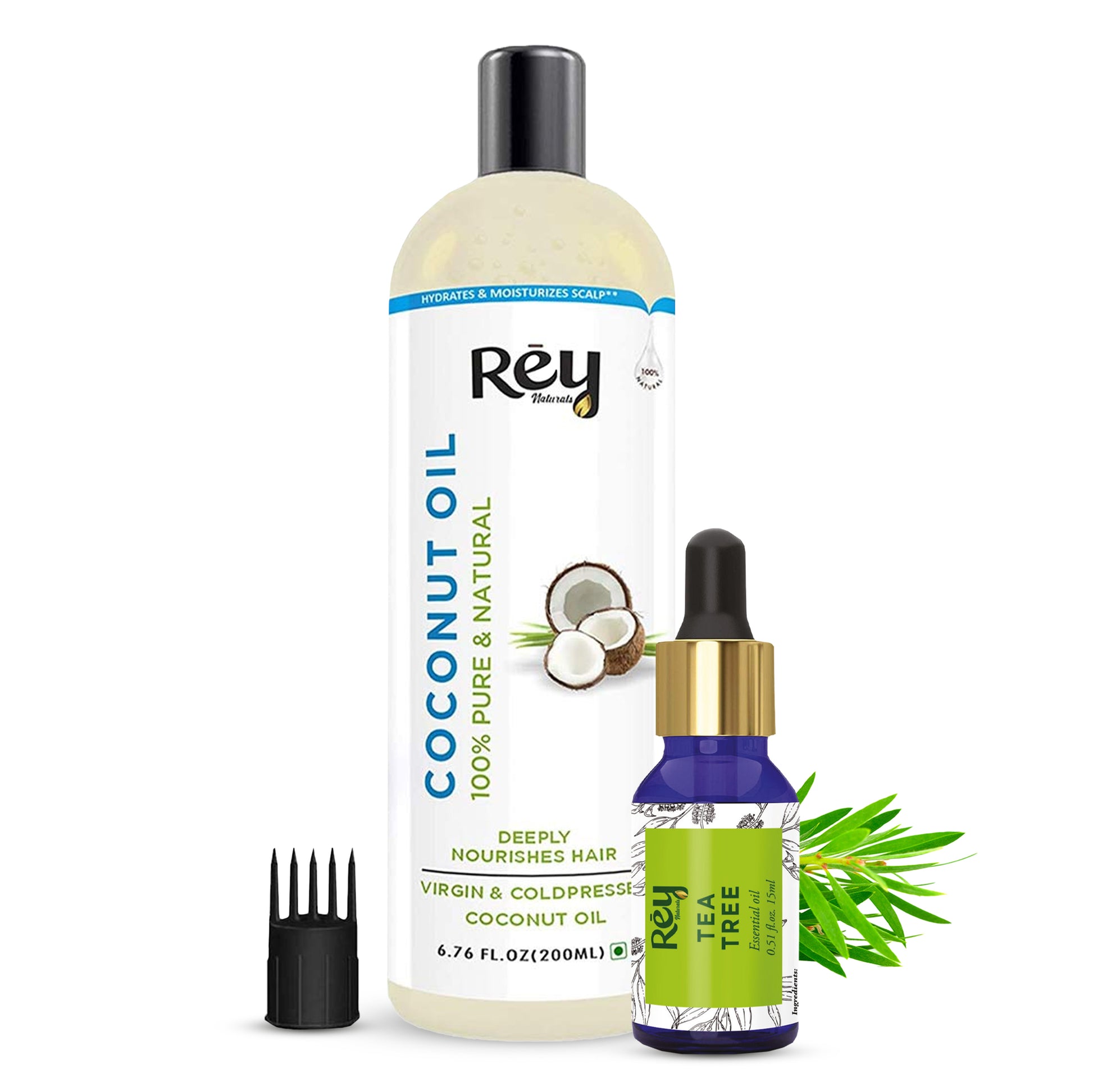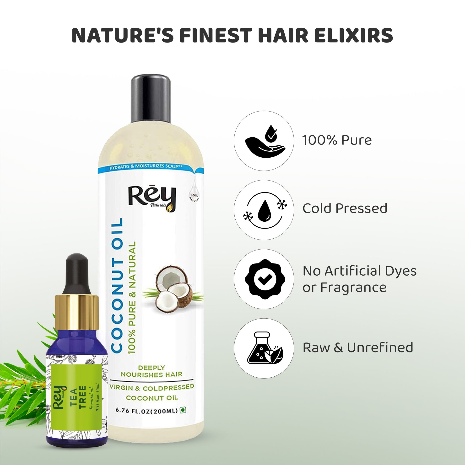 Rey Naturals Tea Tree Essential Oil & Virgin Cold Pressed Coconut Hair Oil | For Improved Scalp Condition & Hair Fall Control | Dandruff, Acne, Aromatherapy & Stress Relief Oil (200+15ML)