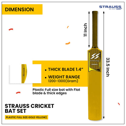 Introducing the Strauss Cricket Combo Kit Set, your ultimate companion for cricket enthusiasts! This full-size kit features a 1 Bat, 1 Ball, 3 Stumps, 2 Bails, and 1 Base, all made from durable plastic/PVC material. The attractive Golden Yellow color adds to its appeal, making it a must-have for players of all ages.